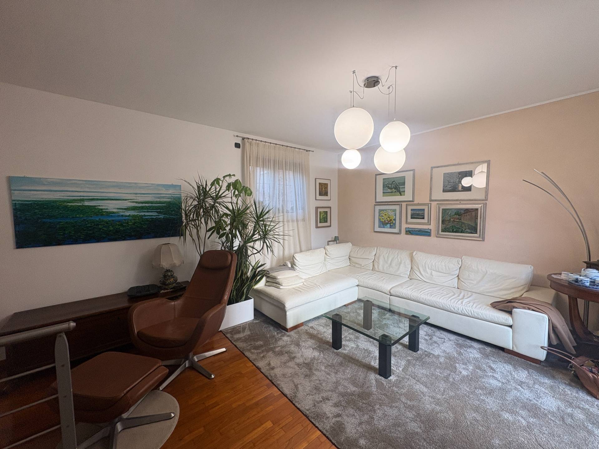 Scendendo cinque gradini si viene accolti da un luminoso soggiorno con affaccio diretto sul giardino privato ad uso esclusivo, uno spazio riservato e vivibile in ogni stagione.