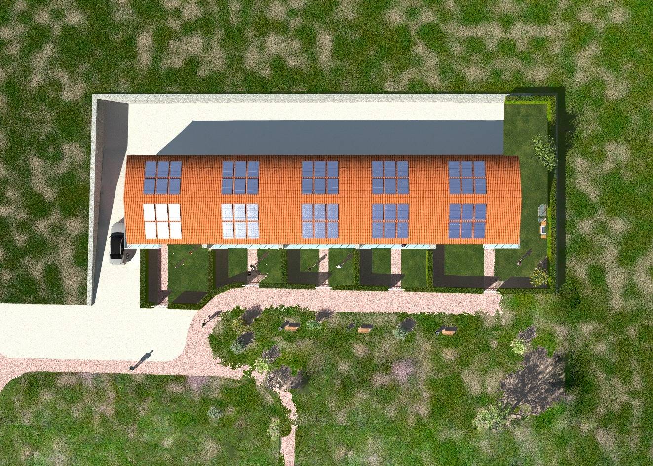 Completano ciascuna propriet ingresso indipendente e giardino privato dalle dimensioni che variano da 35 a 160 mq. La costruzione sar interamente in bioedilizia, ovvero presenter struttura portante in legno e coibentazione in canapa e calce e risulter energeticamente autosufficiente grazie all'installazione dell'impianto fotovoltaico (non previsto l'allaccio del gas!). Si precisa che l'immagine proposta costituisce un semplice modello, che potr essere modificato nelle finiture esterne e nei colori in base alle preferenze degli acquirenti.