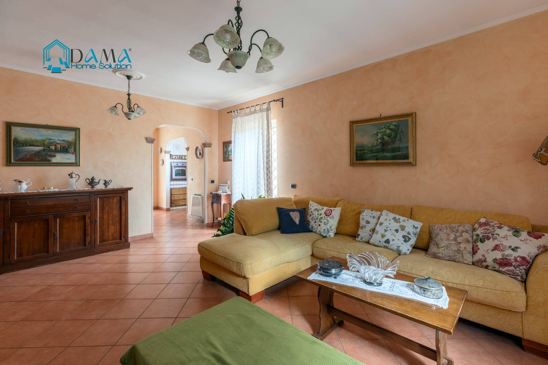 Tramite la porta di ingresso si accede all'ampio soggiorno con camino elegantemente arredato, cucina in muratura separata con annesso tinello che si affaccia all'esterno dove troviamo uno spazioso patio mattonato con barbecue , il tutto contornato dal curato giardino che abbraccia tutta la propriet.