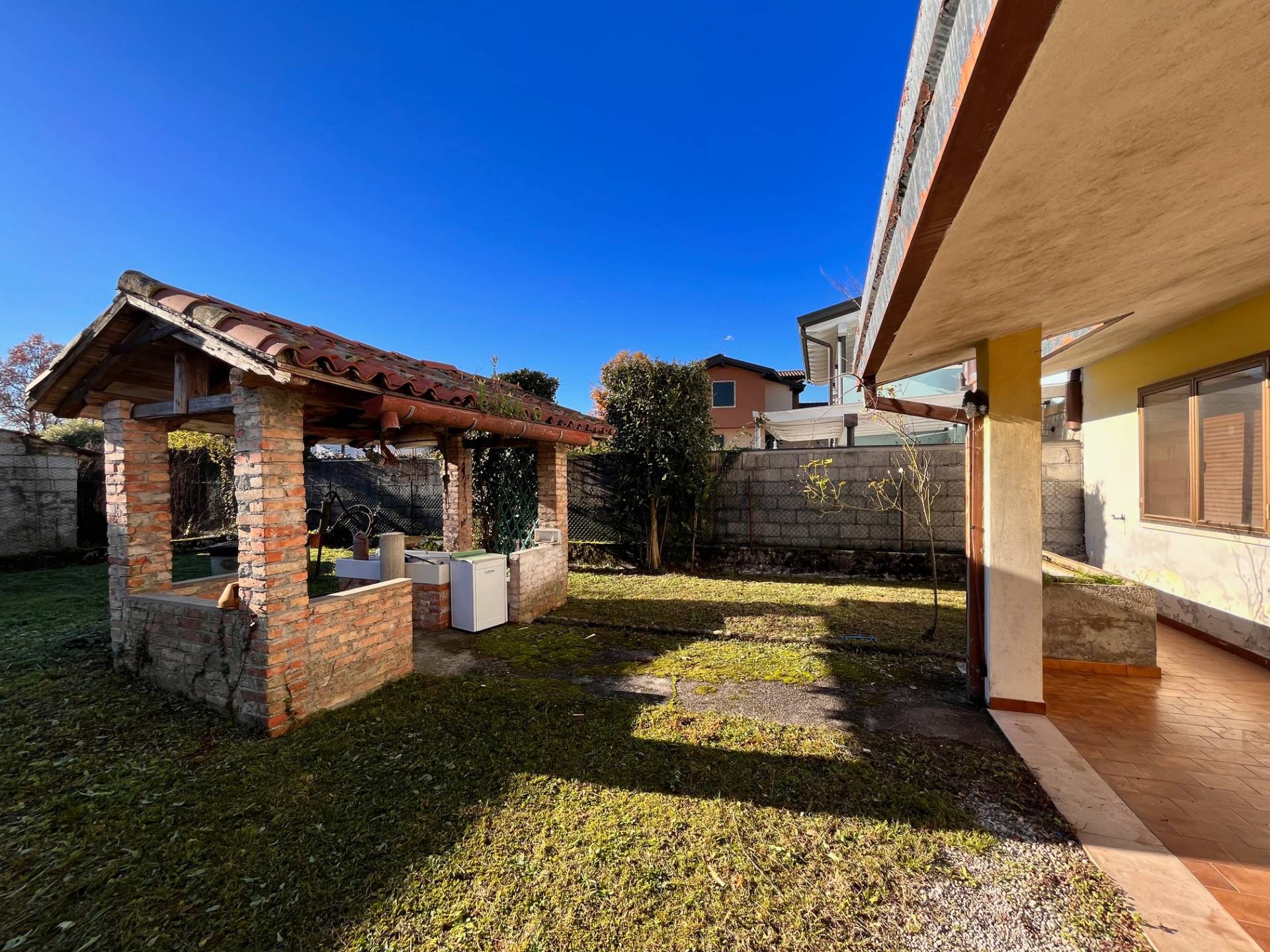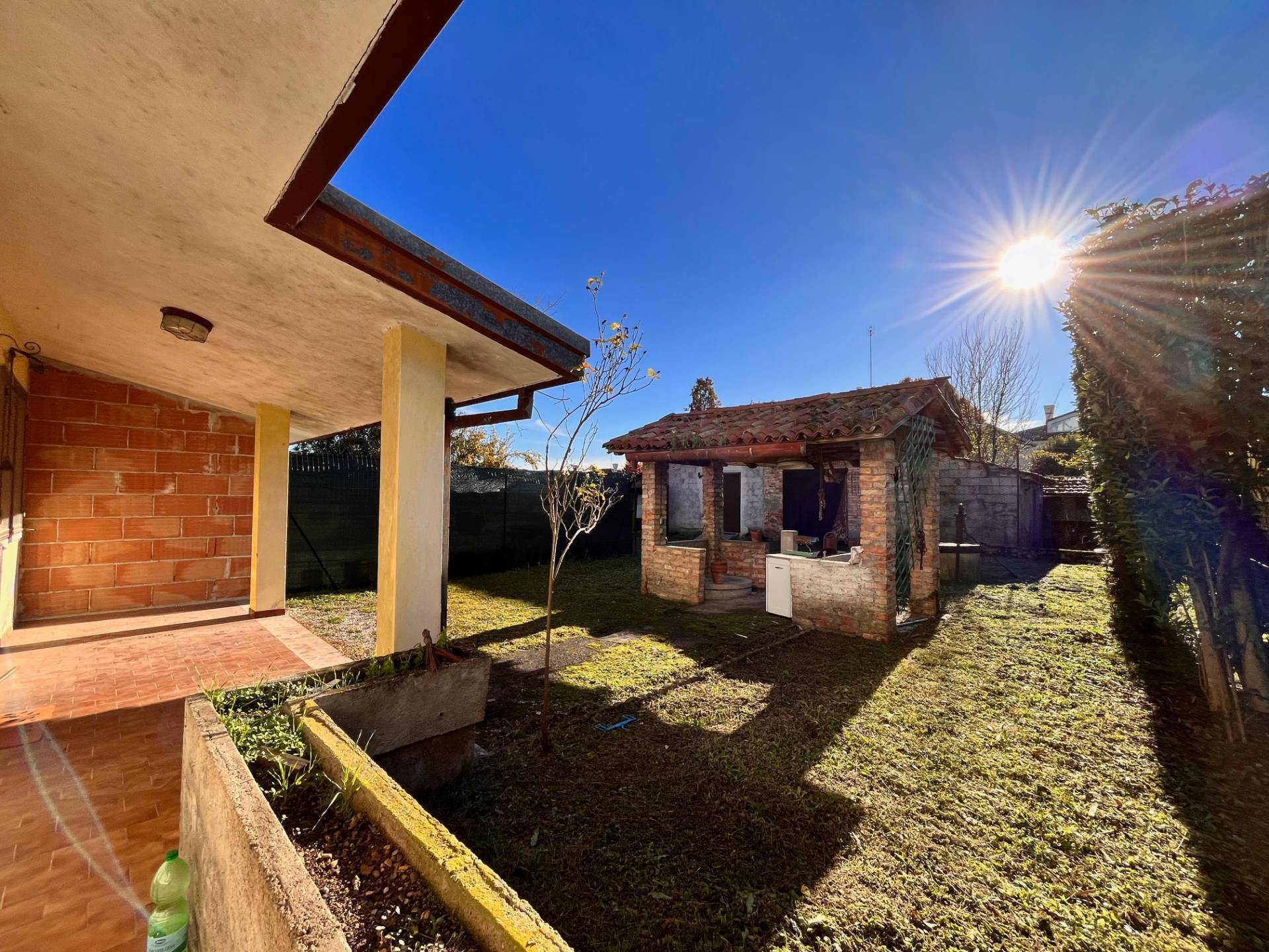 Giardino fronte casa con tettoia e pozzo artesiano e accessorio adibito a ripostiglio e garage.