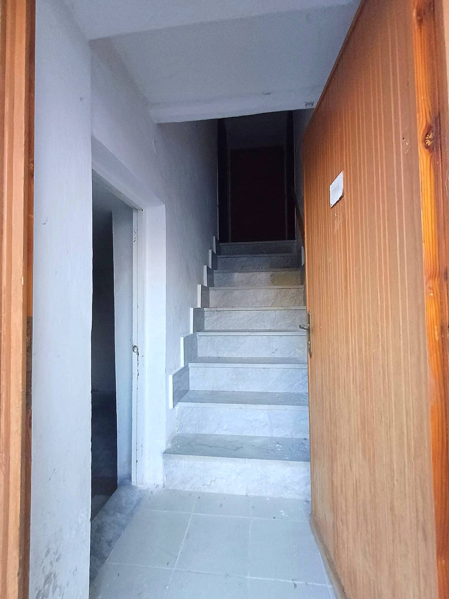 Al piano terra ingresso su scala, accesso a vano di sgombero, bagno e box auto. Al piano primo cucina e sala. Al piano secondo due camere, di cui una con gabinetto di servizio.