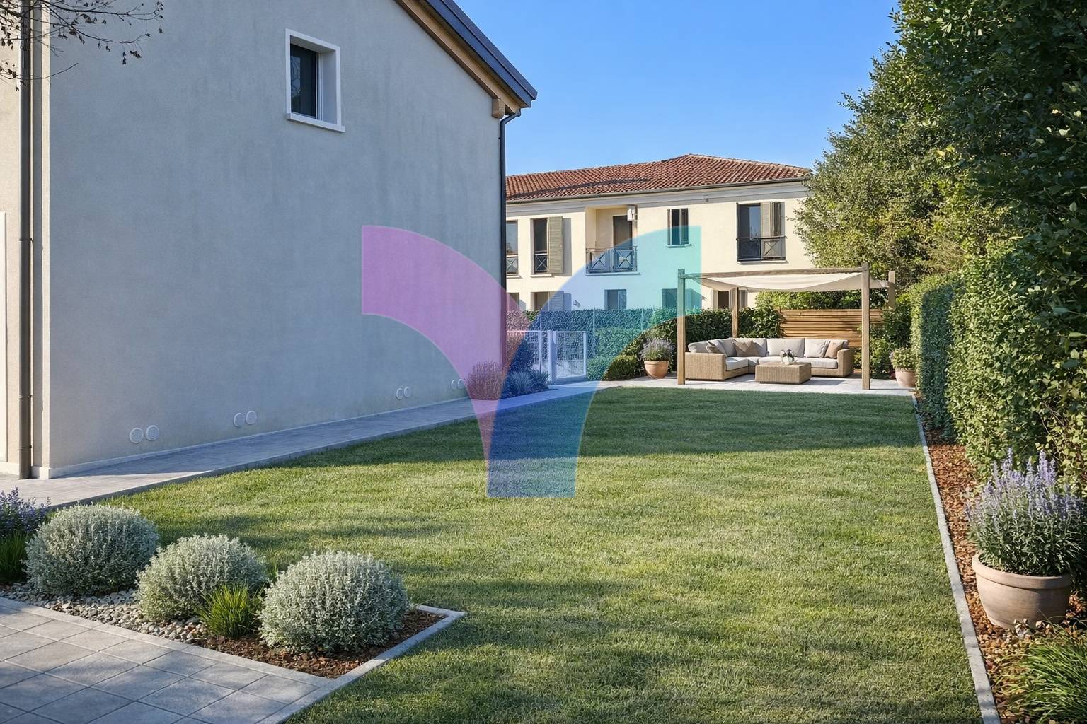 La porzione di una metratura interna di 166 mq suddivisa in due livelli, composta: Ampio soggiorno cucina sparata abitabile, disimpegno, bagno, vano sottoscala tecnico, giardino su due lei di circa 300 mq garage e due posti auto ad uso esclusivo Al piano primo e ultimo, 3 camere bagno Consegna SETTEMBRE 2026 FINITA Finiture: riscaldamento a pavimento, fotovoltaico, caldaia in pompa di calore , pred A/C, infissi in triplo vetro pvc molto altro.