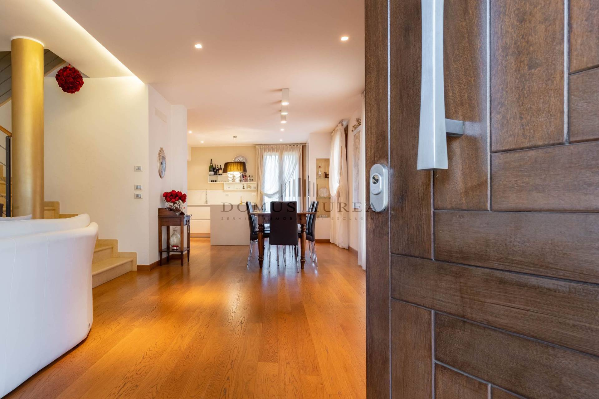 Completano la soluzione tre terrazzi, garage doppio, taverna e lavanderia al piano interrato e una mansarda.