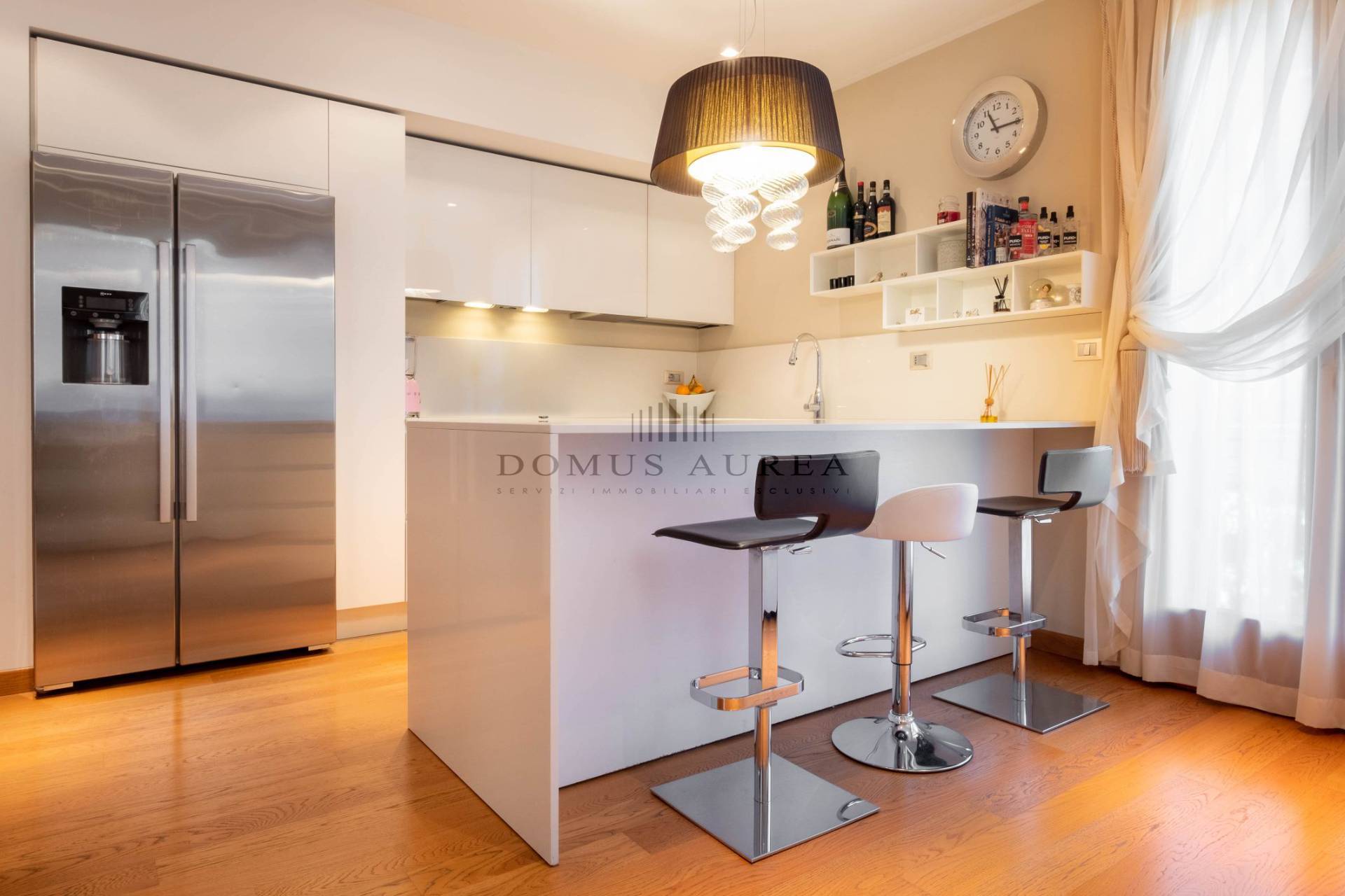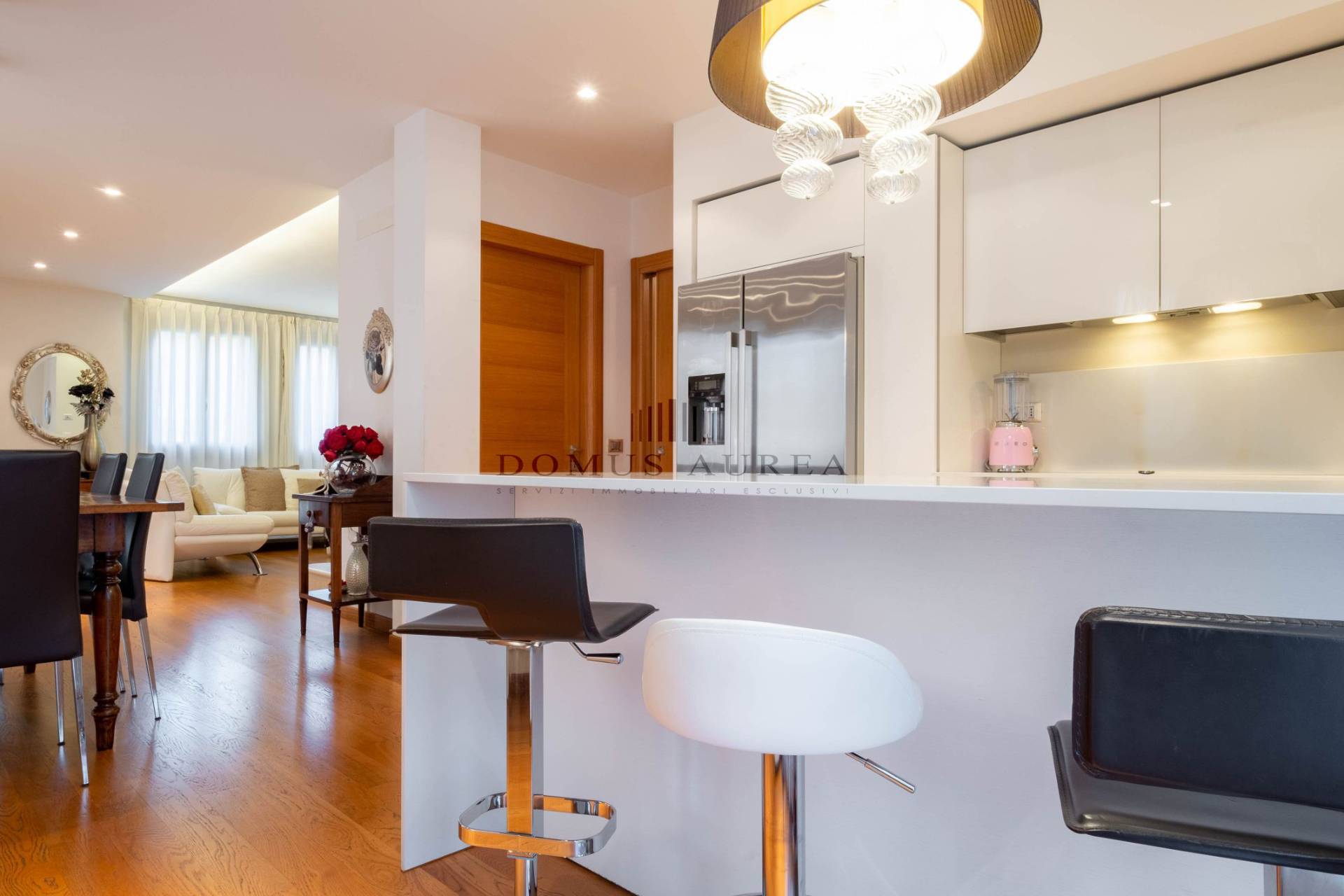 Completano la soluzione tre terrazzi, garage doppio, taverna e lavanderia al piano interrato e una mansarda.