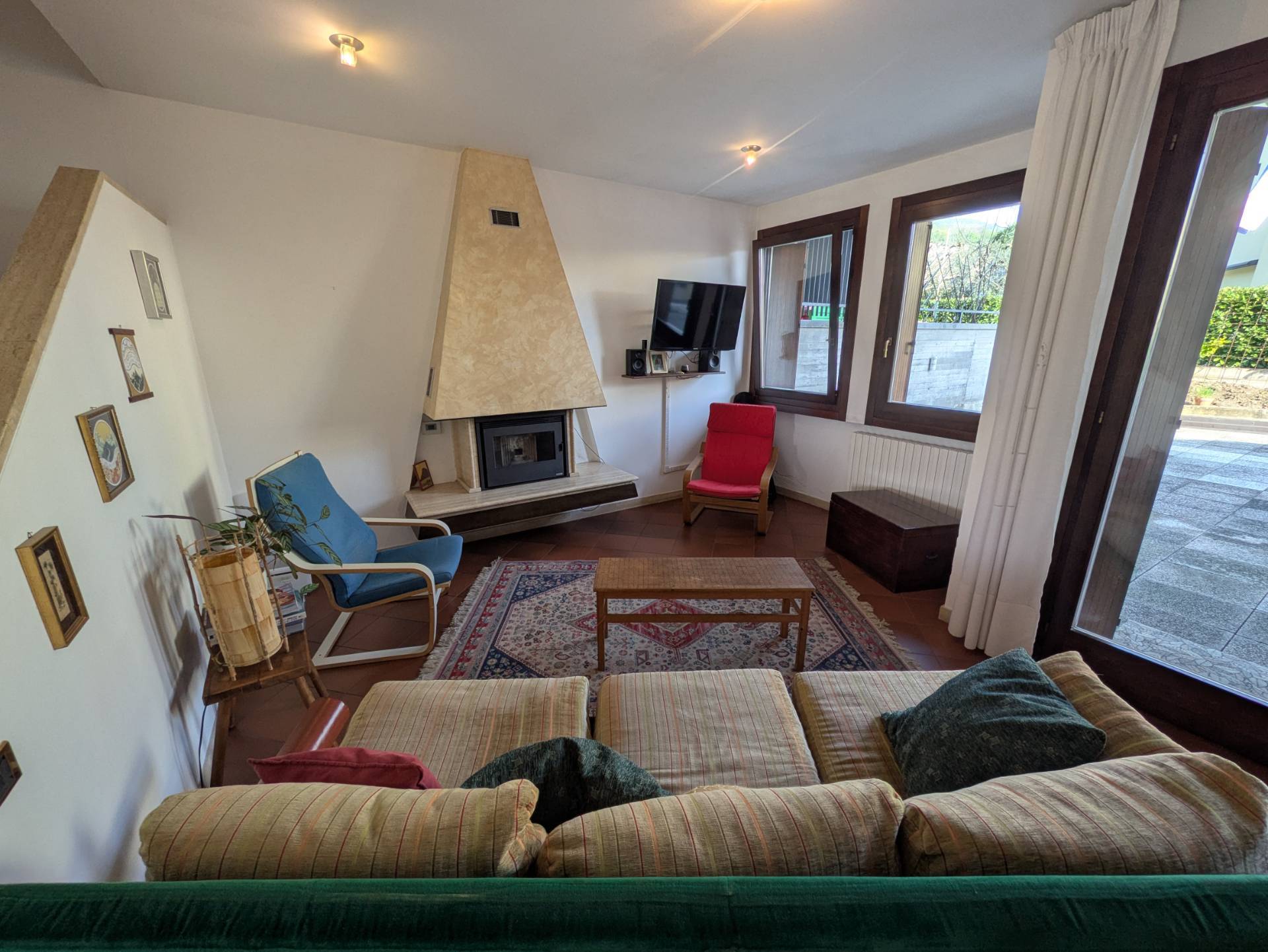 All'interno: Soggiorno luminoso arricchito da un accogliente camino/stufa a pellet.