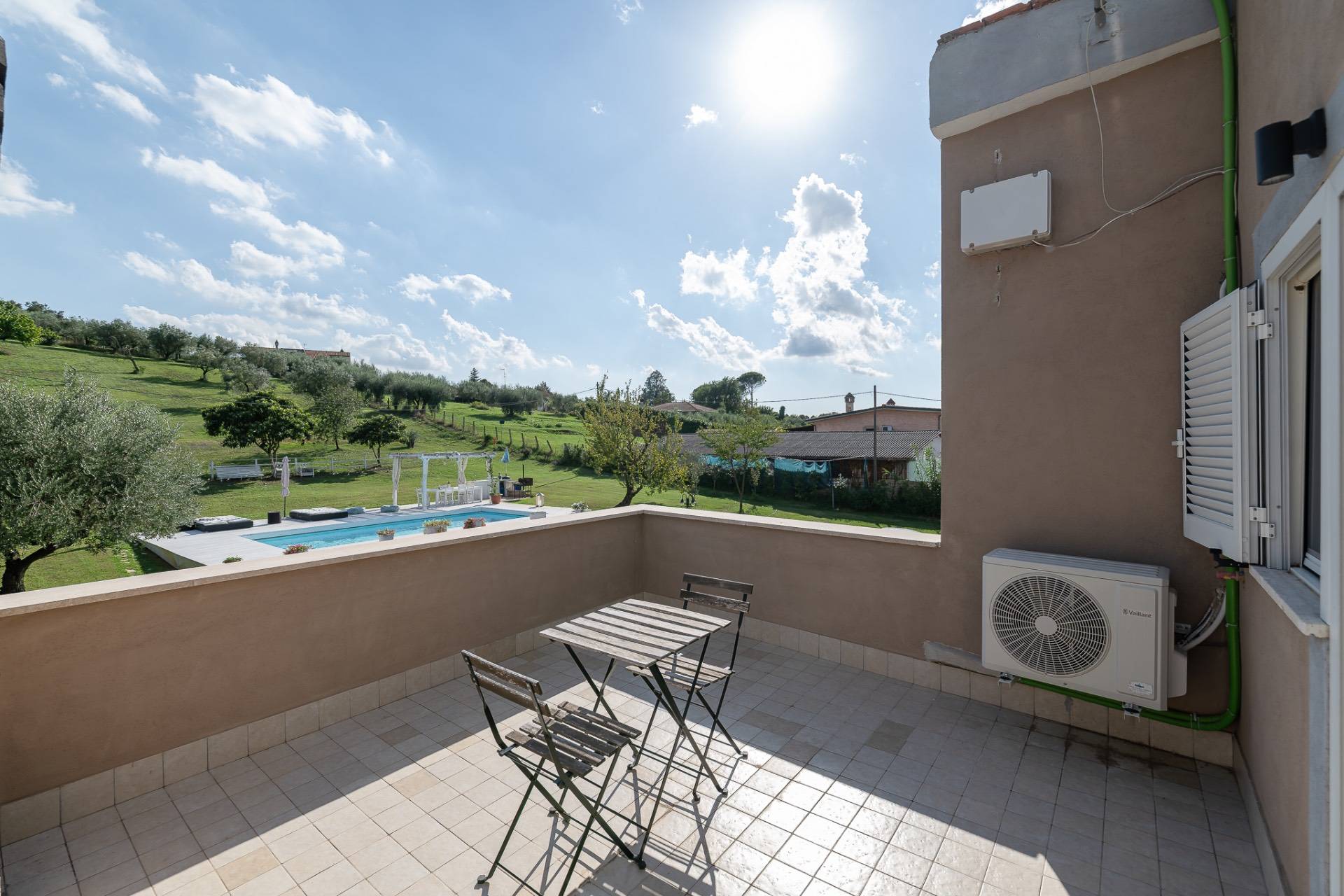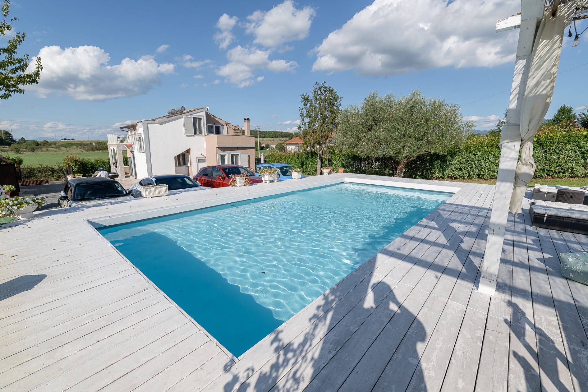 La vera magia si compie all'esterno, dove si estende il parco privato di ben quattromila metri quadrati, un vero polmone verde che circonda la propriet e ospita il cuore pulsante della vita estiva: una bellissima piscina fuori terra con un elegante pool deck in legno e una zona relax attrezzata, perfetta per cene, feste e pomeriggi indimenticabili.
