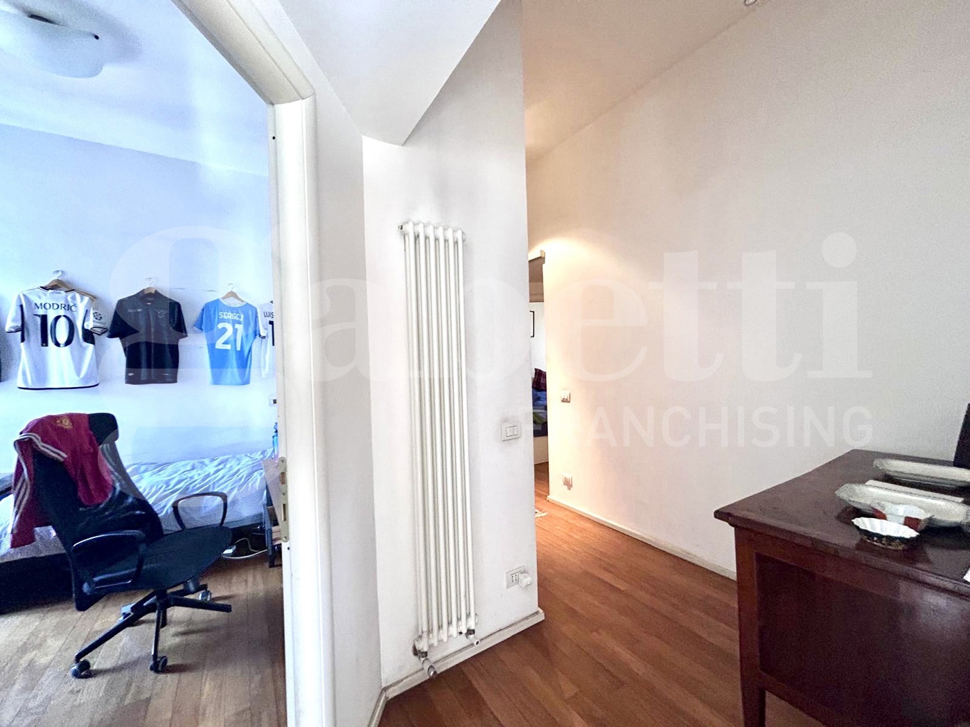 Gli spazi si sviluppano in ampio ingresso finestrato, salone, sala da pranzo, tre camere, cucina abitabile, doppi servizi e due balconi.