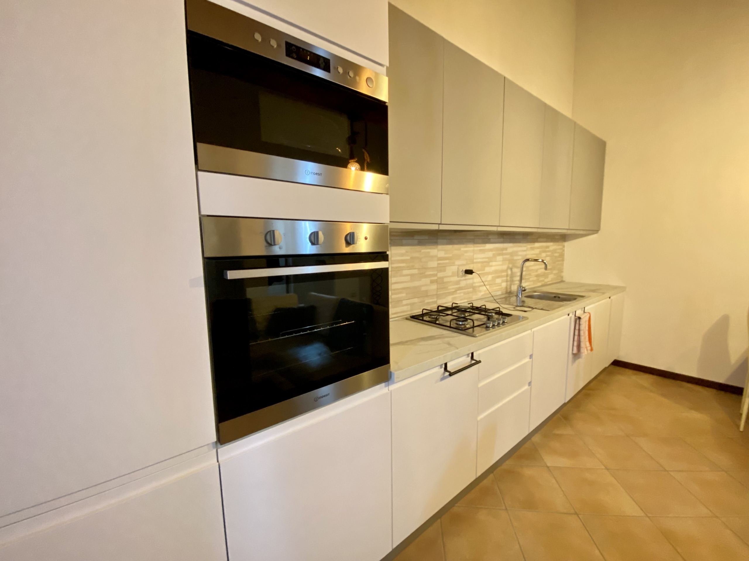 L'appartamento, situato al piano primo, con scala in cui accedono solo due unità immobiliari, è composto da ingresso nel soggiorno con cucina a vista open space, camera matrimoniale e bagno con doccia, al piano terra è presente una stanza finestrata ad uso ripostiglio ed un area esclusiva ad uso parcheggio.