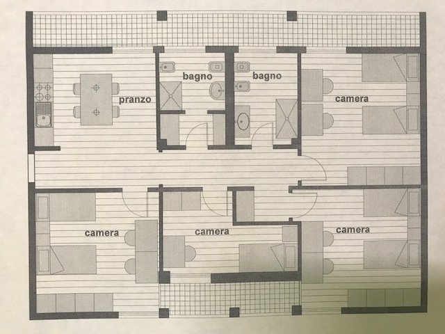 Si compone di cucina abitabile, soggiorno (o terza camera), disimpegno, due camere matrimoniali, una cameretta/studio e DOPPI SERVIZI, oltre ad ampie superfici balconate.