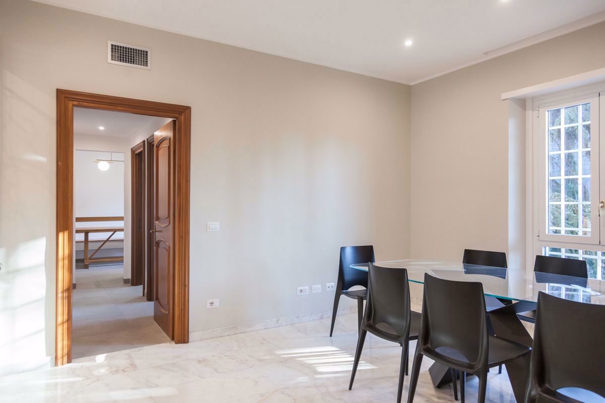 La soluzione immobiliare presenta un'ottima suddivisione interna tra le zone giorno e notte ed composta da ingresso su ampio disimpegno che conduce alla zona giorno, dove troviamo il salone doppio con elegante camino ed ampie finestrature e terrazzo dai quali si pu godere di una panoramica vista sulla Capitale, sala da pranzo, grande cucina abitabile, zona lavanderia e bagno di servizio finestrato con doccia; l'altro disimpegno ci accompagna nella zona notte, composta da tre camere da letto, delle quali una con affaccio sul terrazzino, doppi servizi finestrati con doccia e vasca.