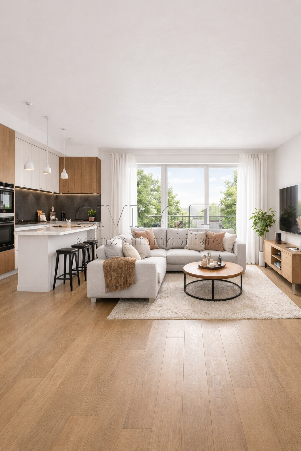 l'appartamento al piano primo un ampio soggiorno con cucina open spiace, tre camere, doppi servizi.