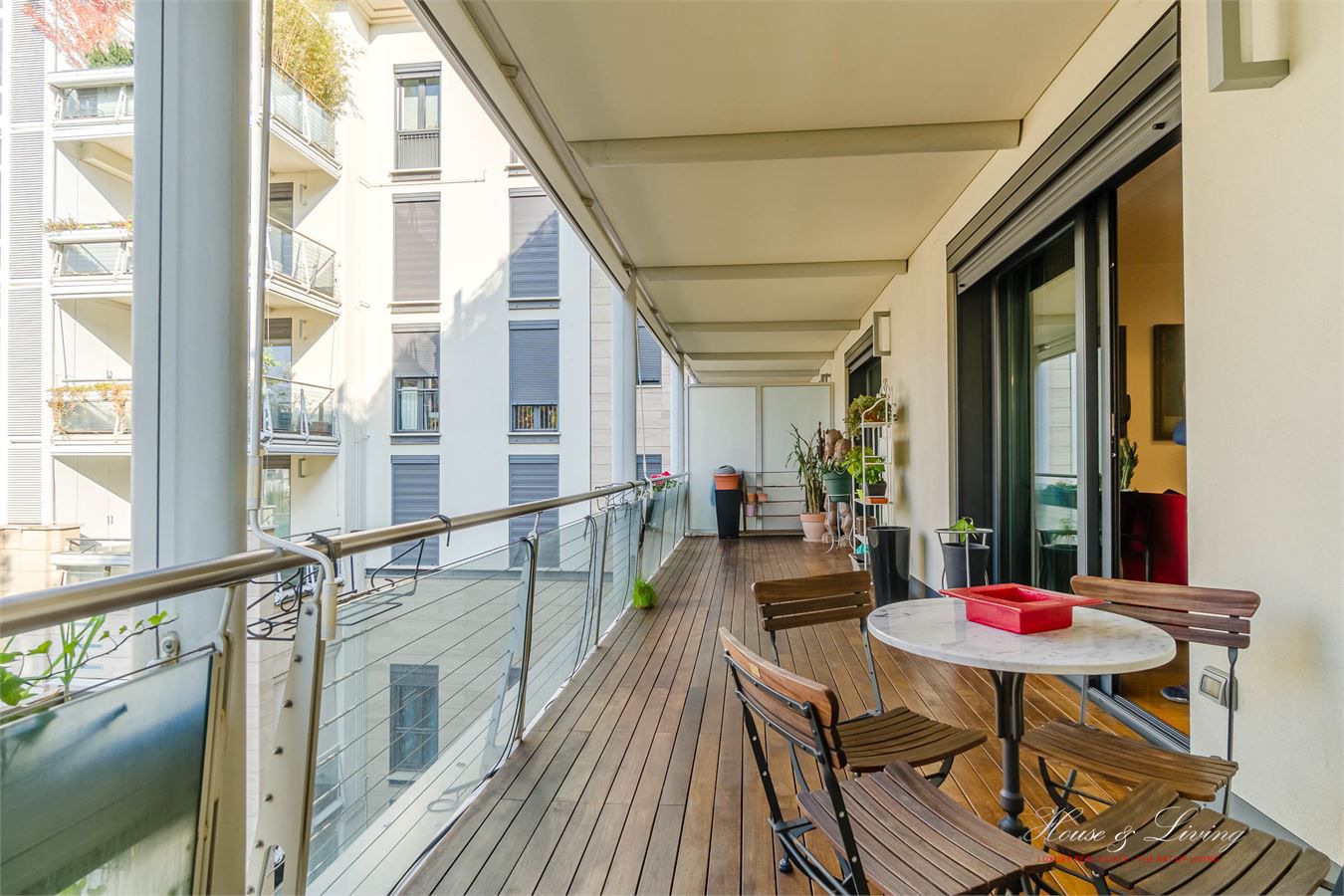 \nDal salone, dalla cucina e dalla camera padronale si accede ad un terrazzo di circa 30 mq. con vista sulla corte interna/giardino condominiale, un ampio spazio verde perfettamente curato con fontane annesse (spazio in cui è consentito il gioco dei bambini).\nLa facciata interna del complesso è caratterizzata dal vetro.