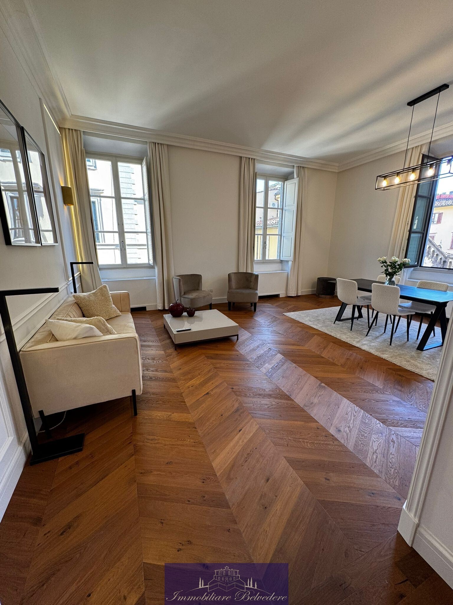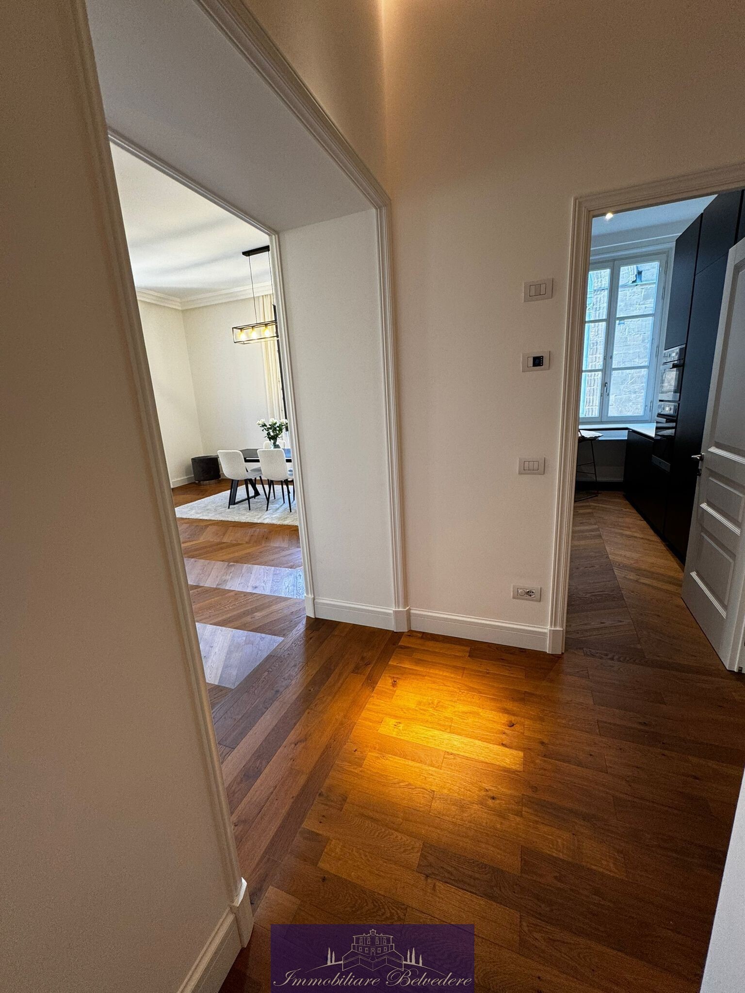 L'appartamento presenta eleganti finiture quali pavimenti in parquet di rovere a spina ungherese, marmo di Carrara, faretti LED incassati e boiserie.