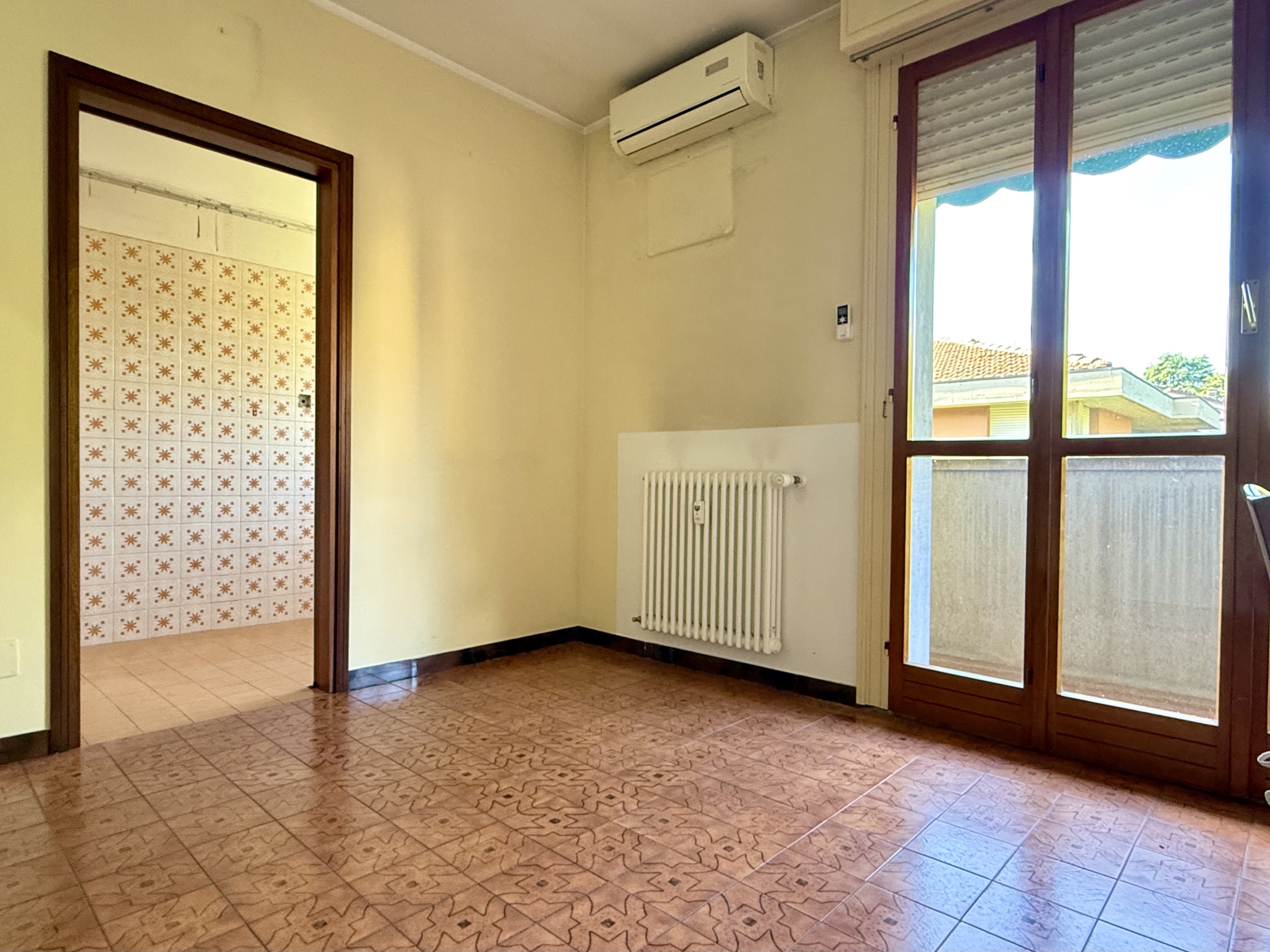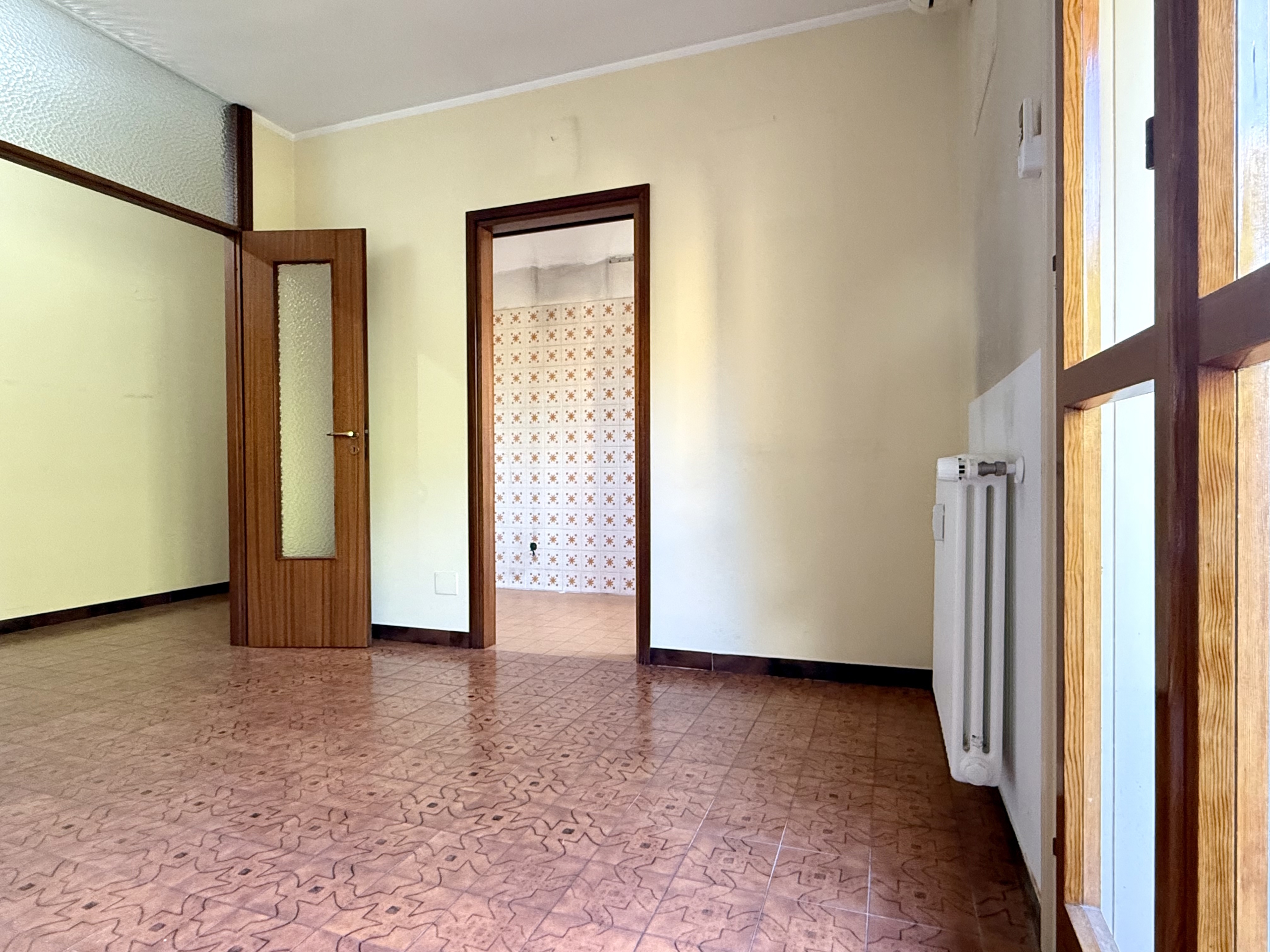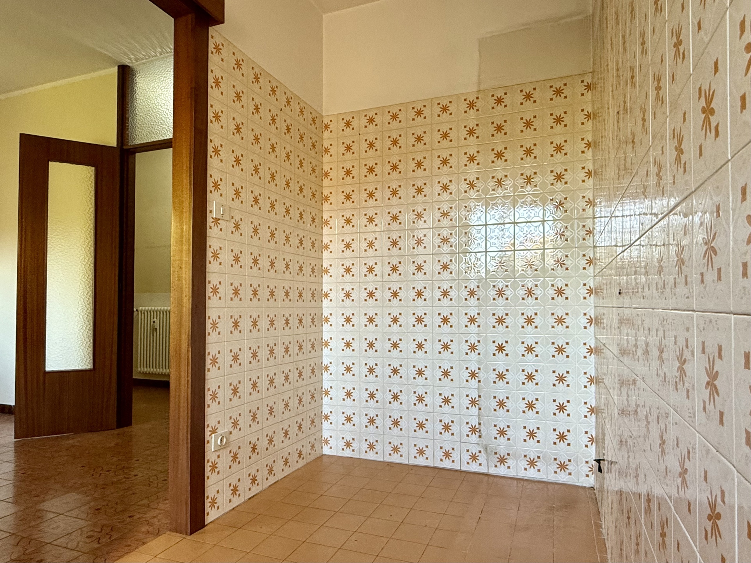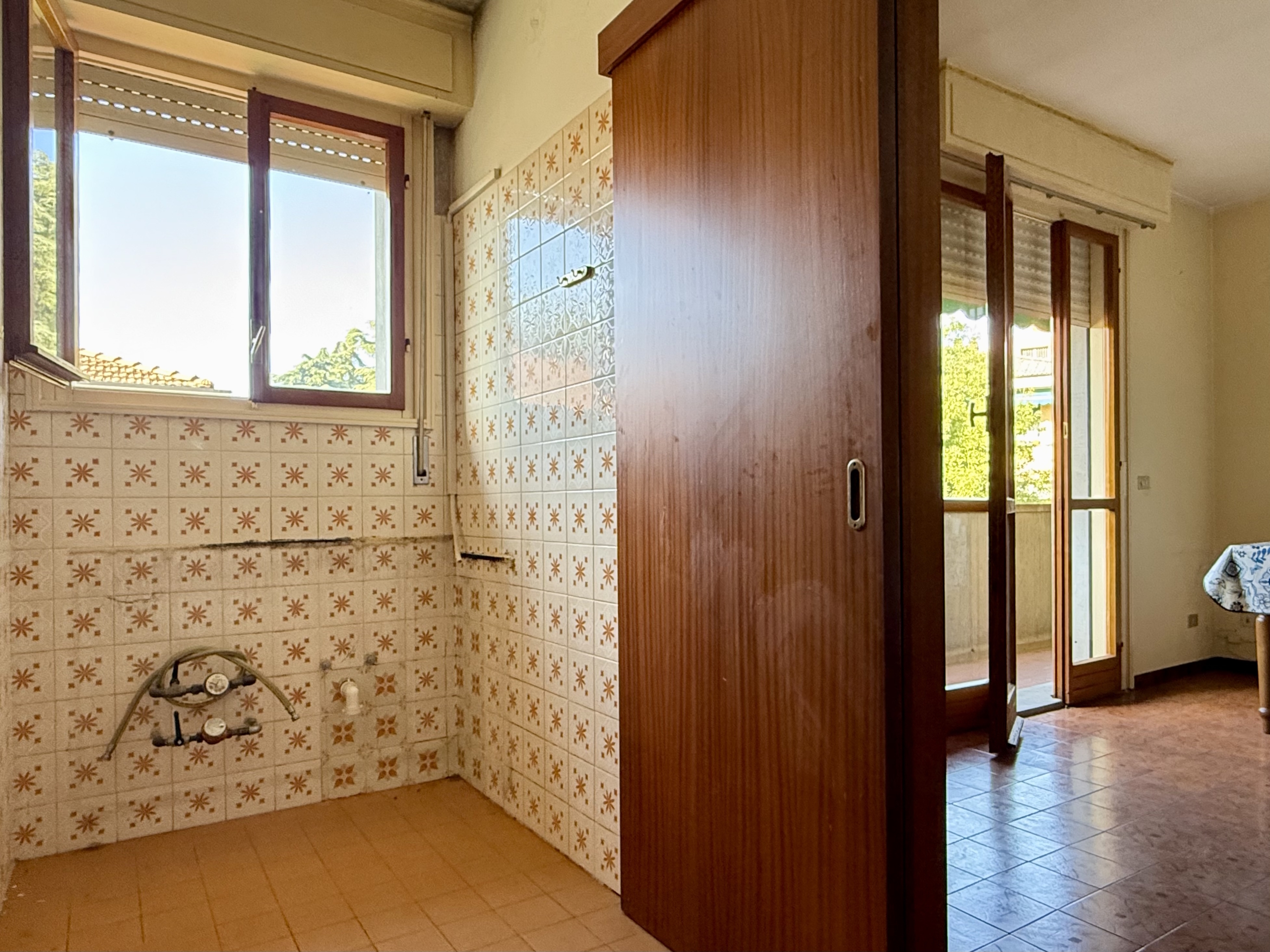 Ingresso, soggiorno con balcone a loggia, cucinetta, 3 camere da letto, di cui una con accesso a loggia verandata, bagno con finestra, cantina e grande autorimessa per due auto. Parzialmente da rivedere internamente.