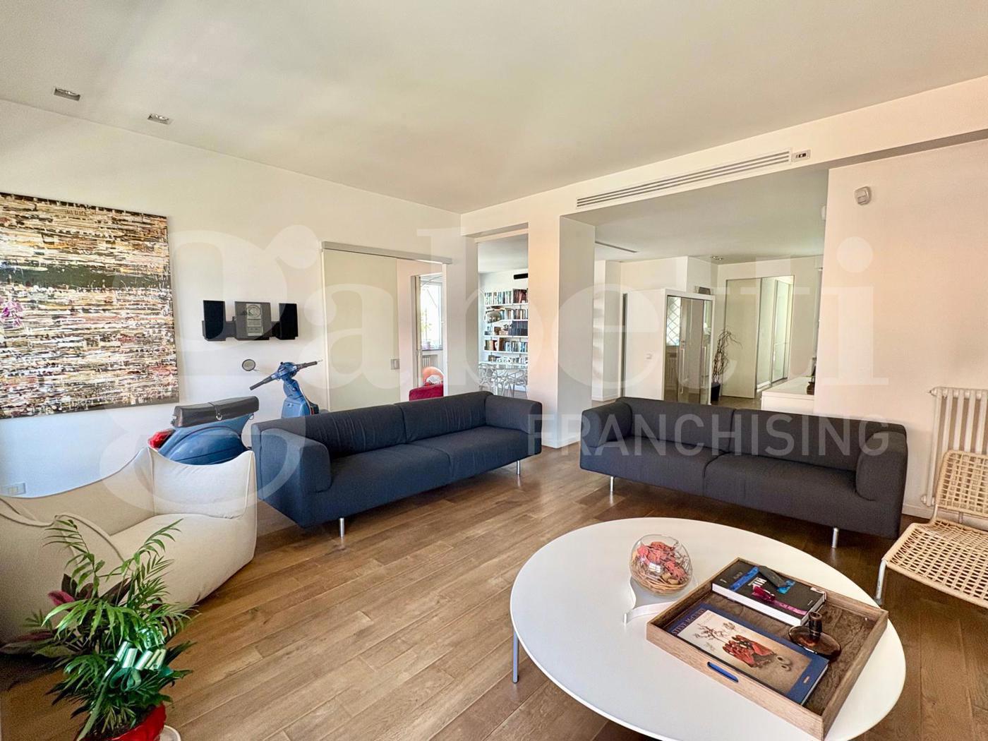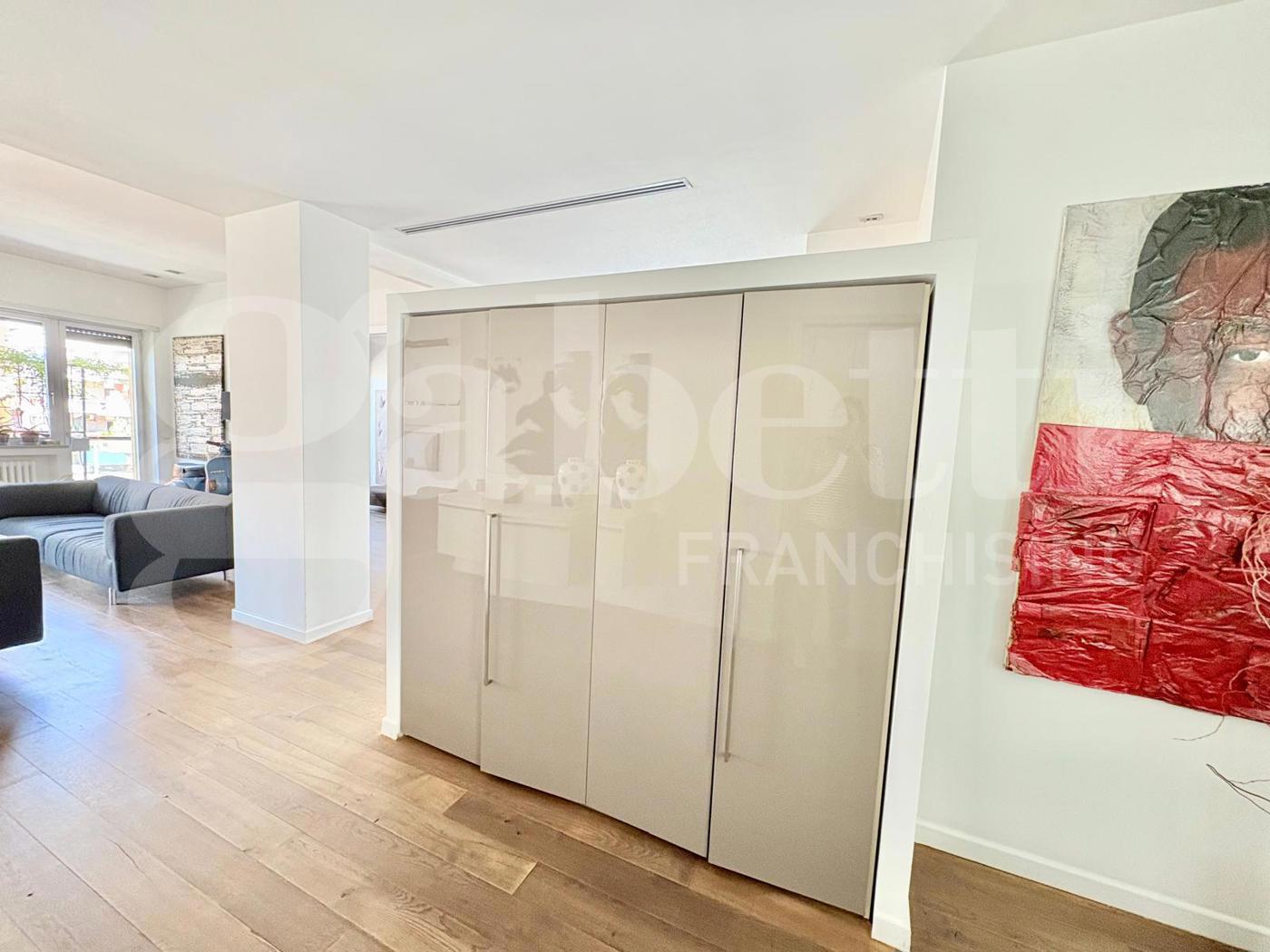 E' inoltre possibile acquistare un box auto. La quadrupla esposizione, le ampie finestre e il piano alto offrono un ottimo riscontro di luce e di aria, presente l'aria condizionata canalizzata in tutti gli ambienti, l'impianto di allarme e la pavimentazione in parquet.