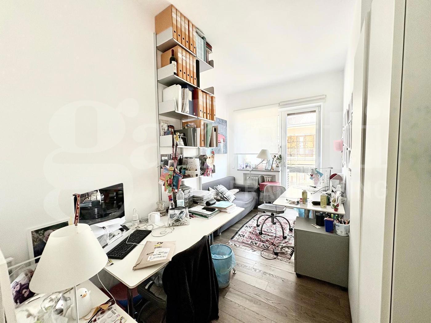 La propriet si compone di doppio ingresso con finestra, luminosa ampia rappresentanza composta da salone doppio e sala da pranzo, grande studio, tre camere, una delle quali completa di cabina armadio e bagno en suite, camera di servizio con bagno e un ulteriore bagno - ognuno dei tre bagni completo di tutti i sanitari e finestrato - cucina, ampie armadiature su misura, quattro balconi e cantina.