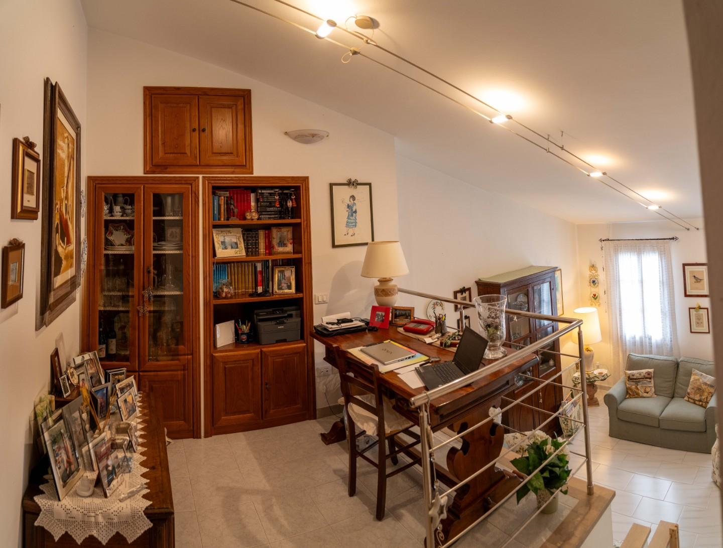 Facente parte di una schiera di quattro unità immobiliari, caratterizzato un doppio ingresso indipendente (pedonale e carrabile) giungiamo all'interno dell'abitazione dove troviamo entrando sulla destra un vano adibito a studio o piccolo salottino di circa 10 mq. Salendo qualche gradino, giungiamo al piano living in openspace, dove sulla destra con un divisorio in vetro ci accoglie la zona pranzo, cucinotto (privo di piano cottura con fuochi ma con induzione) con un'ampia superficie finestrata da cui possiamo apprezzare una stupenda vista mare; sulla sinistra rispetto alla scala il salotto con un caloroso camino; la superficie totale di questo livello si sviluppa per oltre 45 mq, saliamo ancora di qualche gradino e troviamo nella zona notte, uno spazio anchesso adibito a studio, due camere da letto e il bagno.