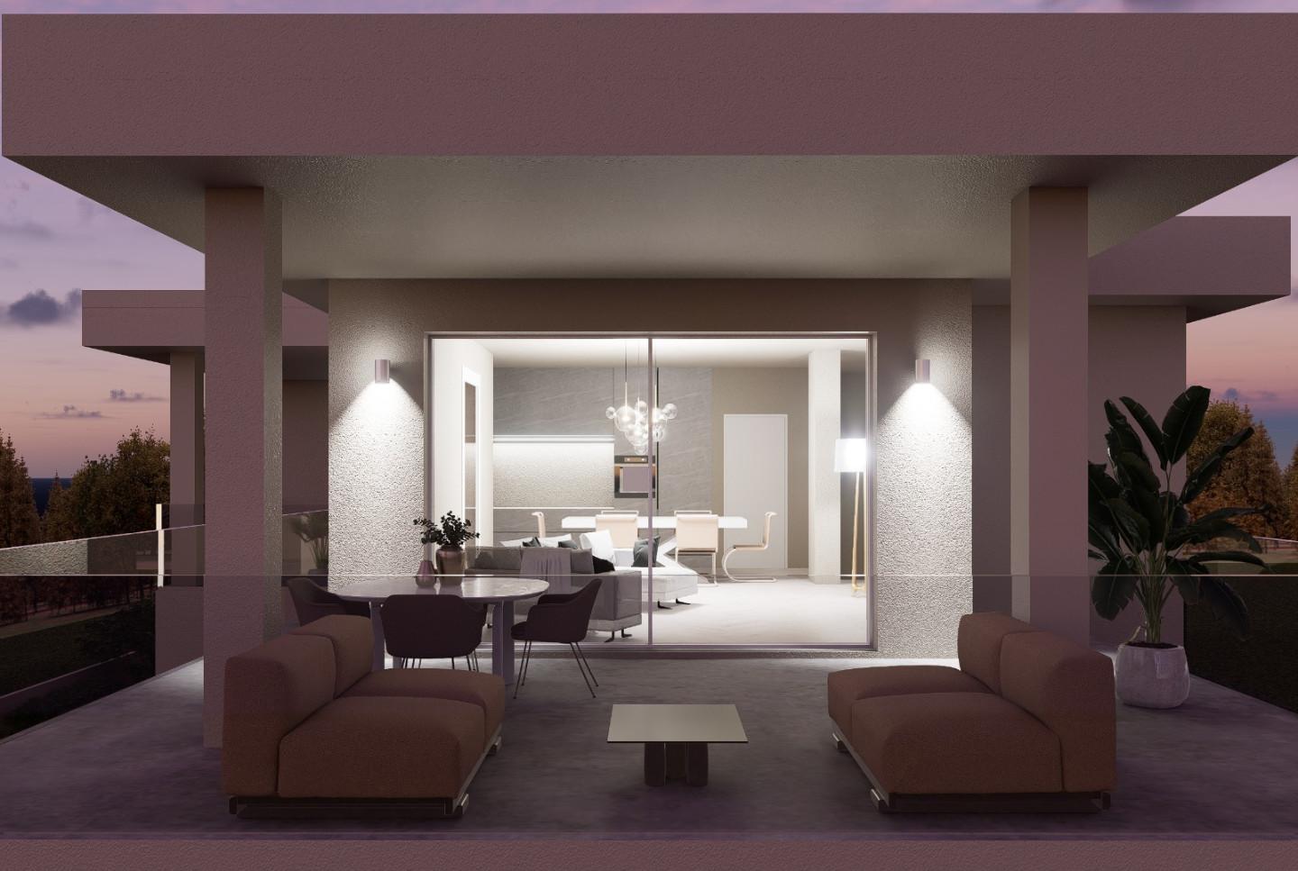 L'immobile avrà ingresso indipendente, giardino e due posti auto. Internamente sarà cosi suddiviso, dalla scala esclusiva interna saliamo al piano primo dove ci accoglie una grande zona living di circa 40 mq con un terrazzo di 25 mq di cui 12 mq a loggiato, disimpegno notte, bagno, ripostiglio , camera matrimoniale con bagno privato e loggiato e altre due camere . Al piano terra locale tecnico.