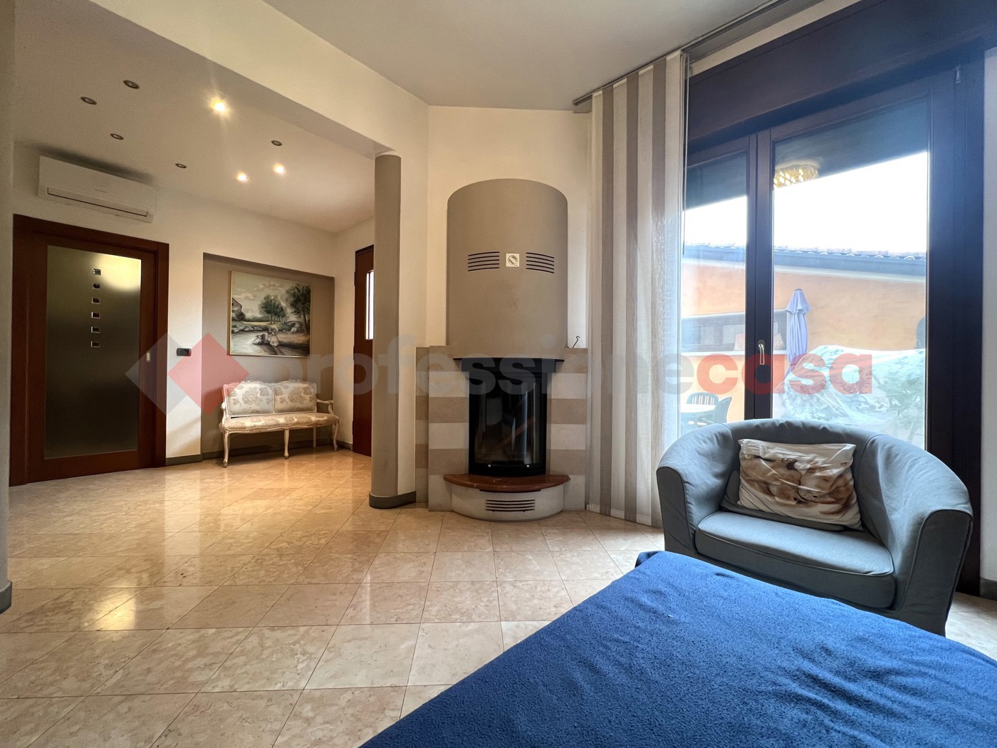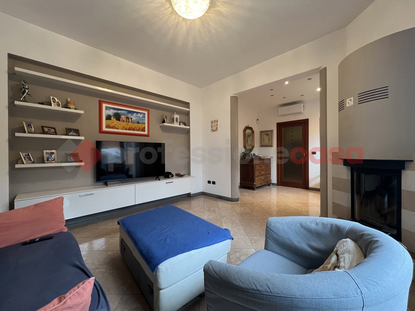 Lingresso introduce a una zona giorno accogliente e ben organizzata, con cucina abitabile e una piacevole zona living impreziosita dal camino.