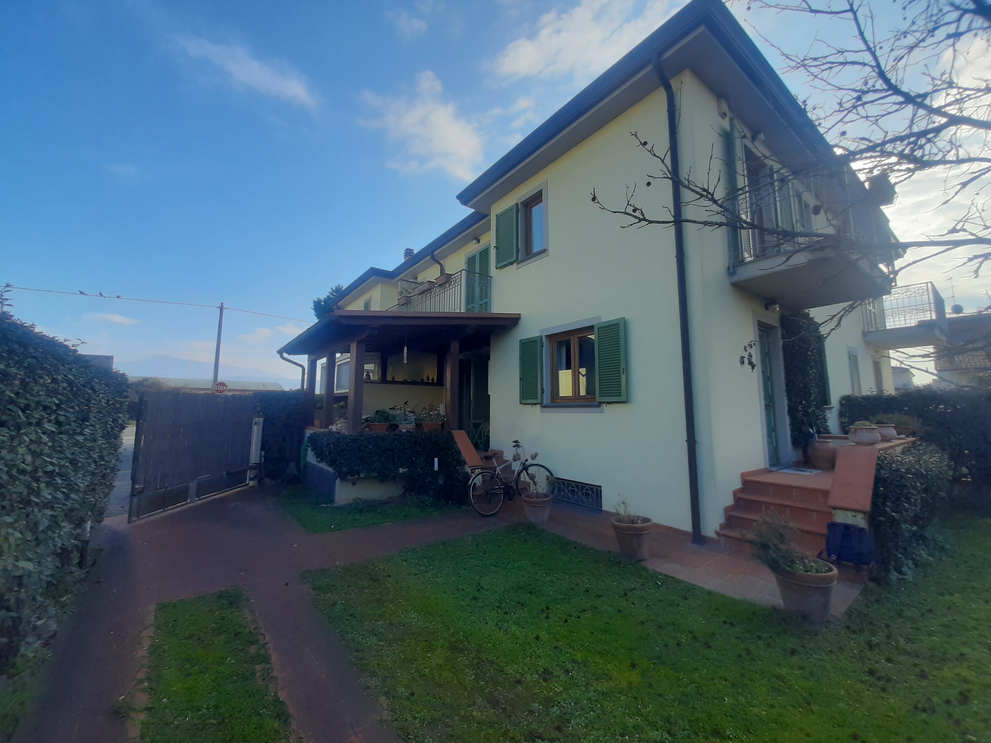 Corredata da porticato in legno a copertura del terrazzo accessibile dalla cucina, da piccola balcone antistante lingresso, nonché da giardino privato posto sui due lati liberi delledificio.