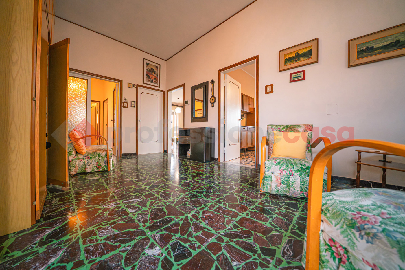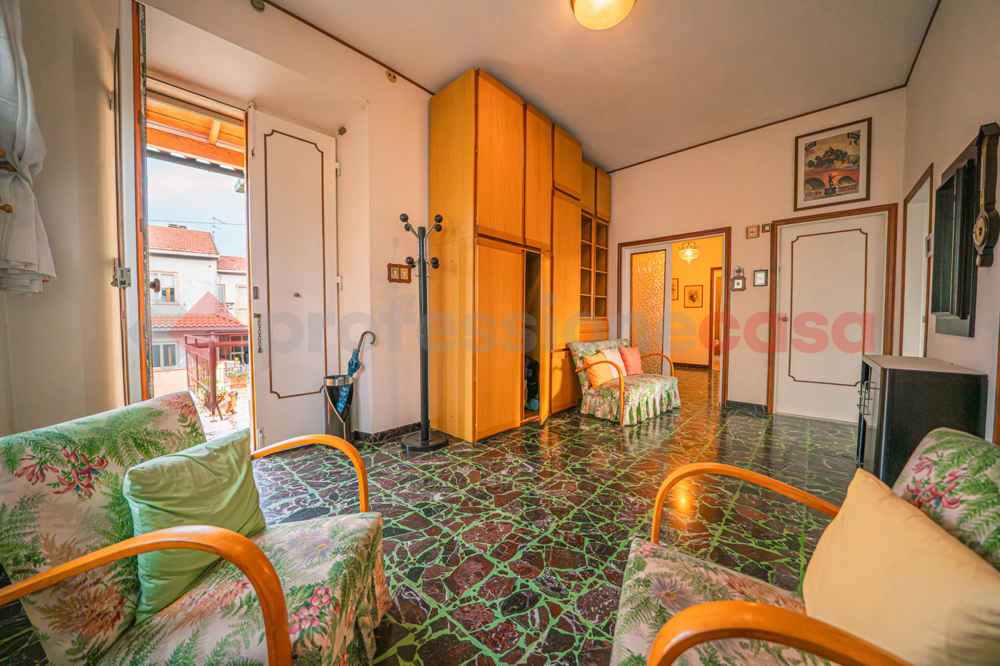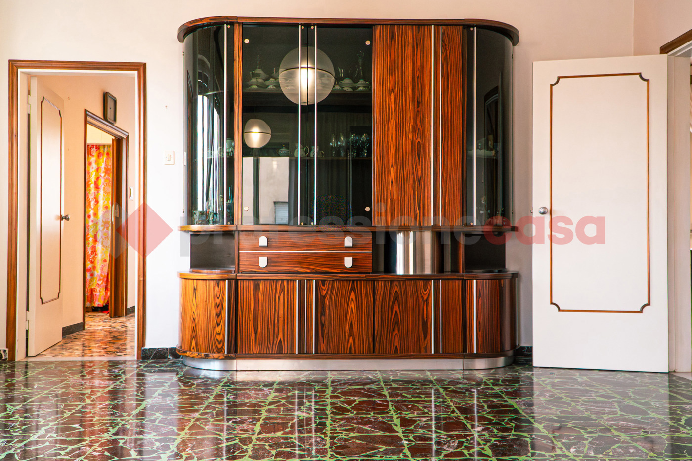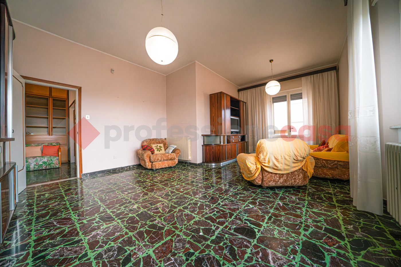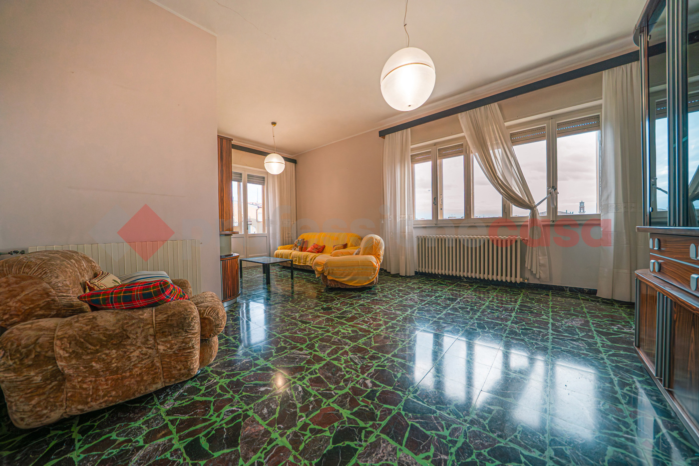 Dalla cucina si raggiunge il grande salone, caratterizzato da ampie vetrate e da una porta finestra che conduce al balcone.