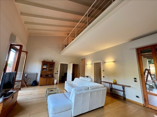 dall' ingresso dell' immobile abbiamo un disimpegno con due ingressi di cui uno porta all'appartamento principale e l' altro al bilocale con soggiorno angolo cottura un servizio finestrato e camera matrimoniale l'appartamento principale invece e' composto, al piano principale da ampia sala con balcone e loggia, cucina abitabile con ripostiglio e con altro accesso alla loggia, un servizio con doccia e finestra; da una scala si accede al piano sottotetto dove si trova un bel soppalco che si affaccia sul soggiorno e da cui si accede a una camera matrimoniale con bagno finestrato esclusivo e cabina armadi e' una stanza sottotetto con finestra e tetto.