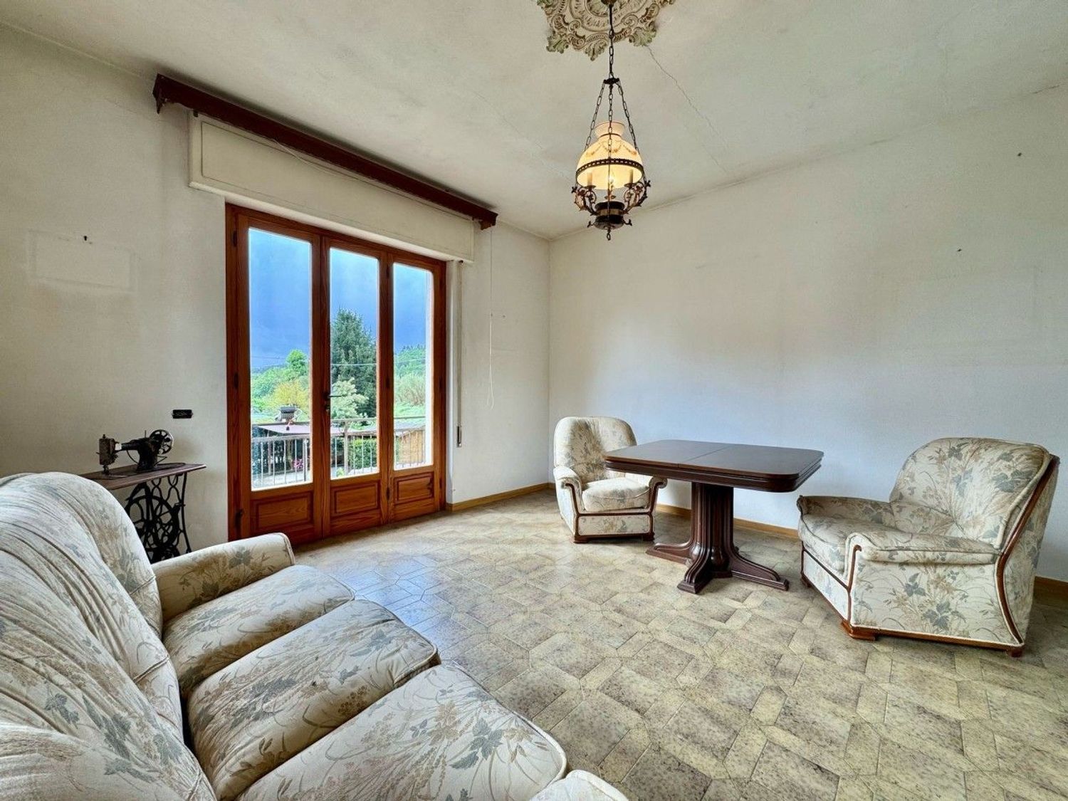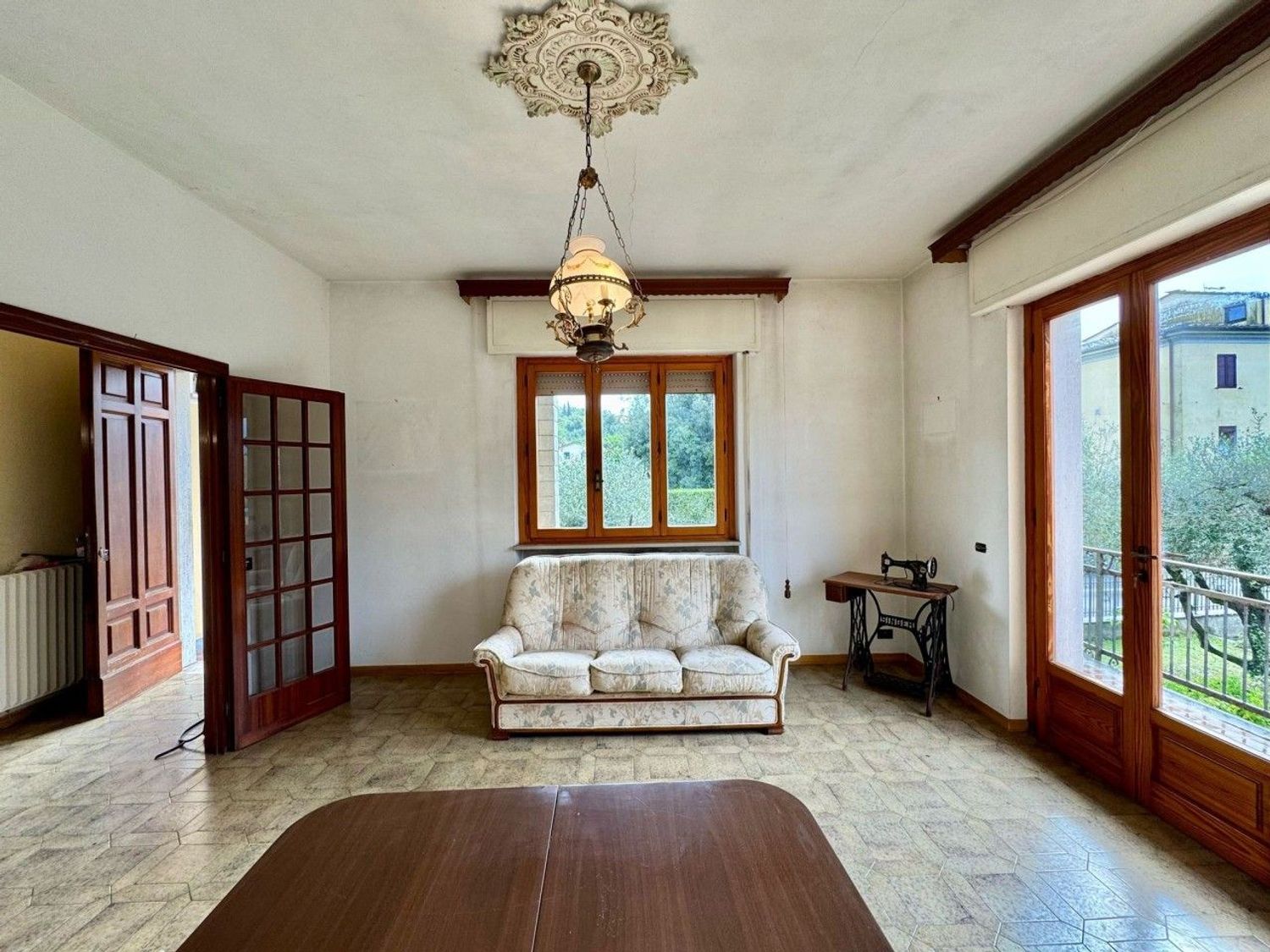 La distribuzione degli spazi interni è quella tipica degli anni '70: ci accoglie in un disimpegno ampio, seguito da un un soggiorno con doppie vetrate e un balcone.