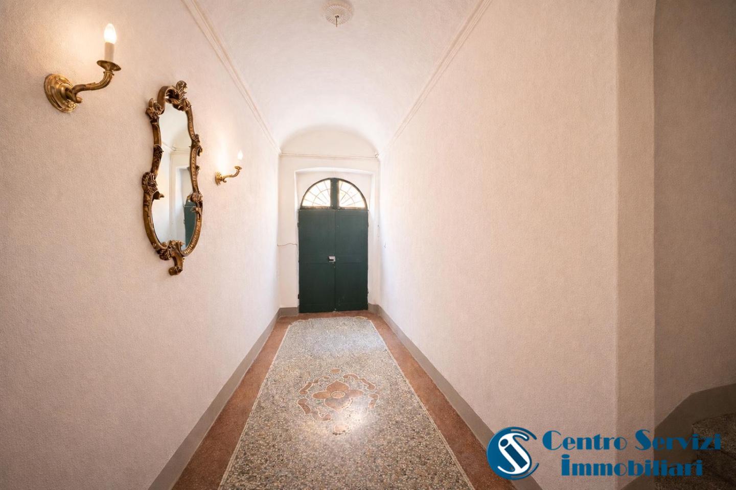 Lappartamento si distingue per un elegante salone di rappresentanza, impreziosito da affreschi di metà 800 e da un piacevole affaccio sul giardino, al quale si accede direttamente dal soggiorno, ideale per momenti di relax e convivialità. La cucina, separata ma direttamente adiacente al salone, garantisce continuità tra gli ambienti; ben organizzata e funzionale, è pensata per un utilizzo pratico e quotidiano, completa la zona giorno un comodo ripostiglio.