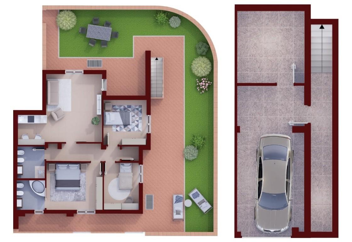 Zona notte comprende, una camera matrimoniale con bagno en suite finestrato, una camera media, una camera singola un secondo bagno e ripostiglio Al piano seminterrato cantina e garage con accesso esterno.