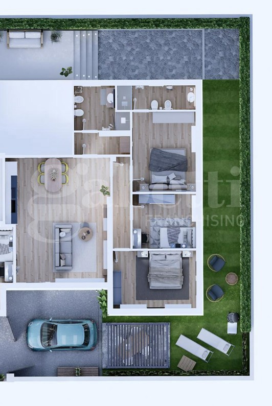 Composto da ampia e luminosa zona giorno di oltre 30 mq perfetta per i tuoi momenti di relax., tre camere da letto, doppi servizi finestrati e un giardino esclusivo dove goderti l'aria aperta in totale riservatezza.
