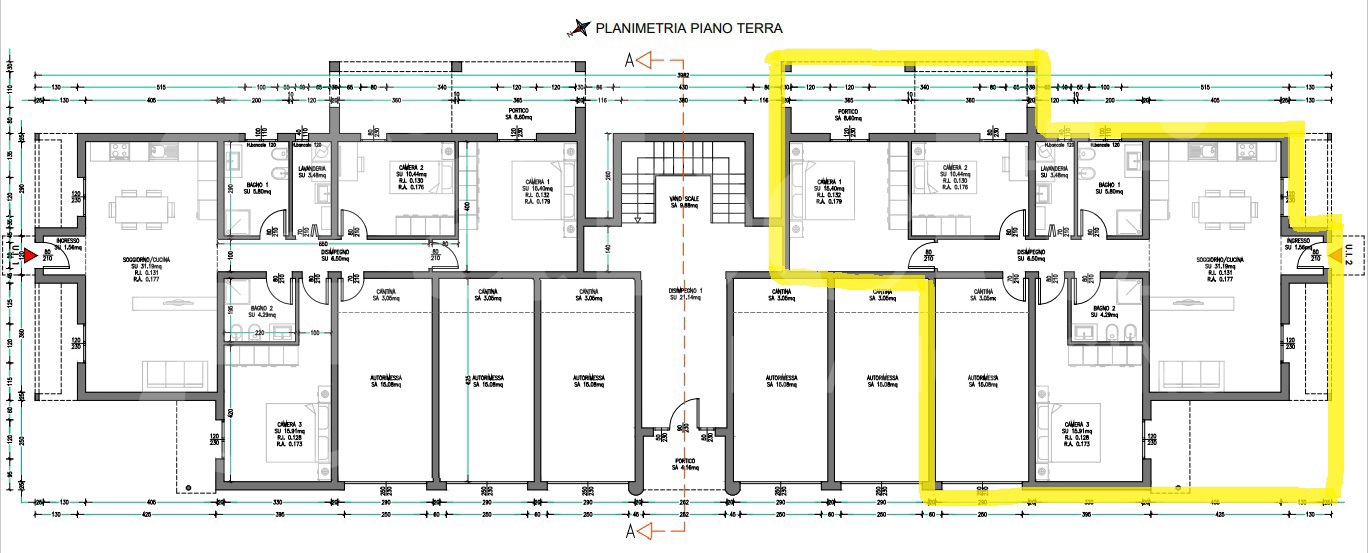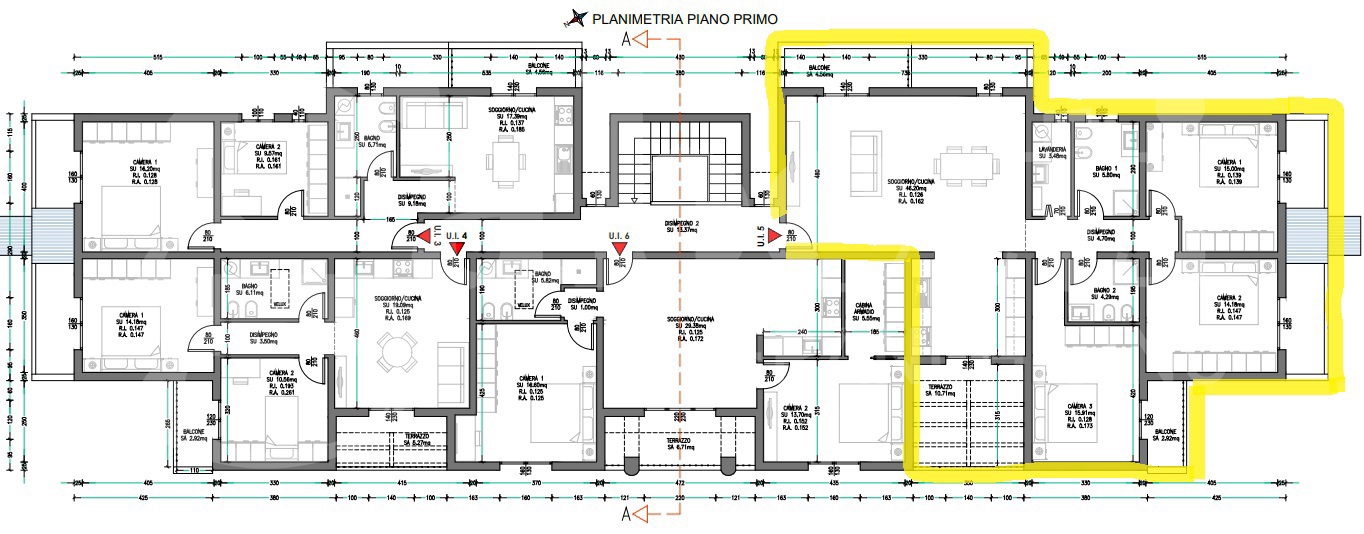 Piano primo: ULTIMO appartamento che dispone di balcone, sala e angolo cottura o cucina, tre camere da letto e due bagni, caratterizzato da ambienti luminosi e ben distribuiti.