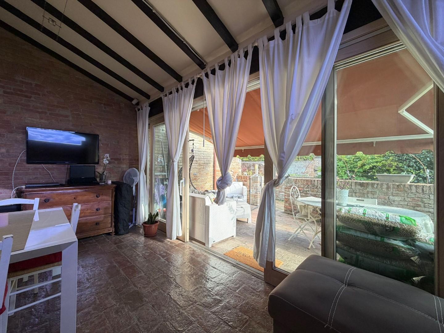 A disposizione anche tre posti auto privati scoperti, un valore aggiunto raro e prezioso in questa zona della città. ? Composizione interna Labitazione si apre su un ambiente accogliente e raffinato, dove ogni dettaglio è stato studiato per unire comfort e stile: Salotto suggestivo ricavato nel porticato completamente vetrato, con ampia porta scorrevole a tutta parete che dona continuità tra interno ed esterno, creando unatmosfera unica di luce e trasparenze.