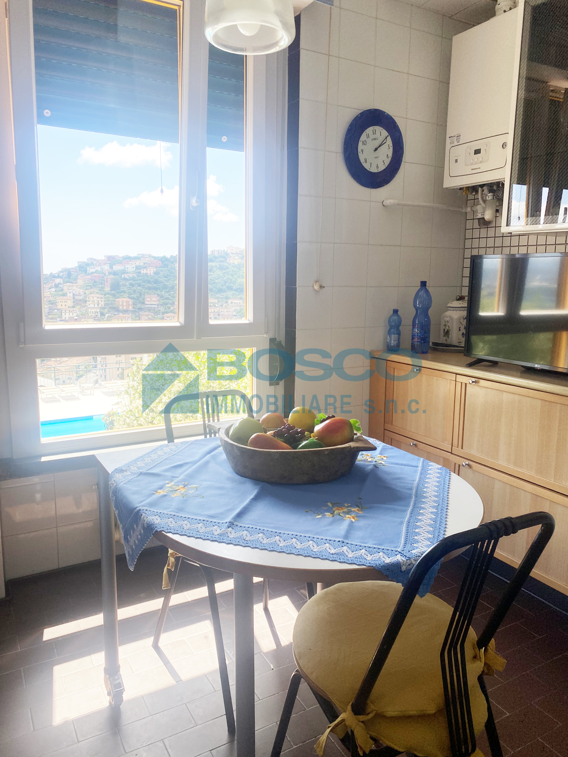 La cucina è abitabile, anch'essa con vista mare. La zona notte include tre camere da letto e due bagni.