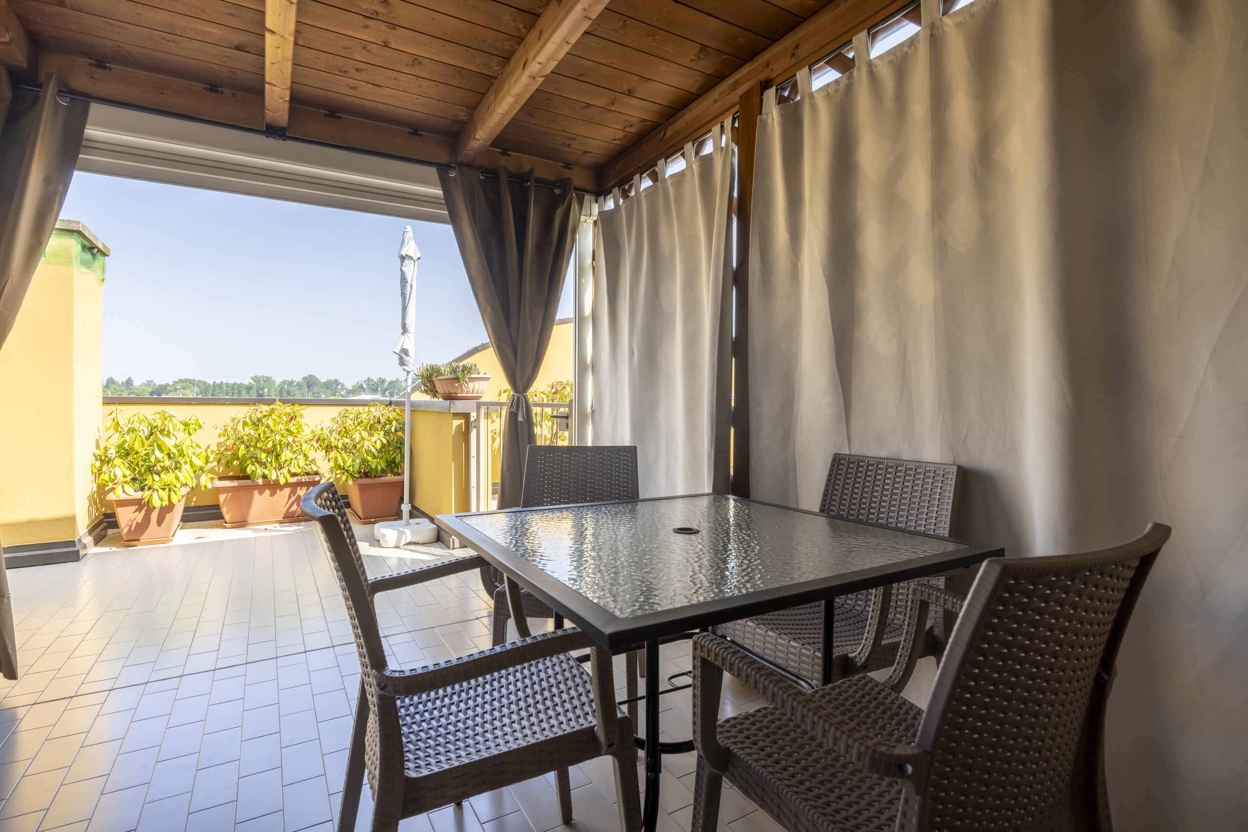 Al piano sovrastante - con accesso dalla sala - grande vano mansardato con meraviglioso terrazzo di mq 21 in proprietà esclusiva e parzialmente coperto.