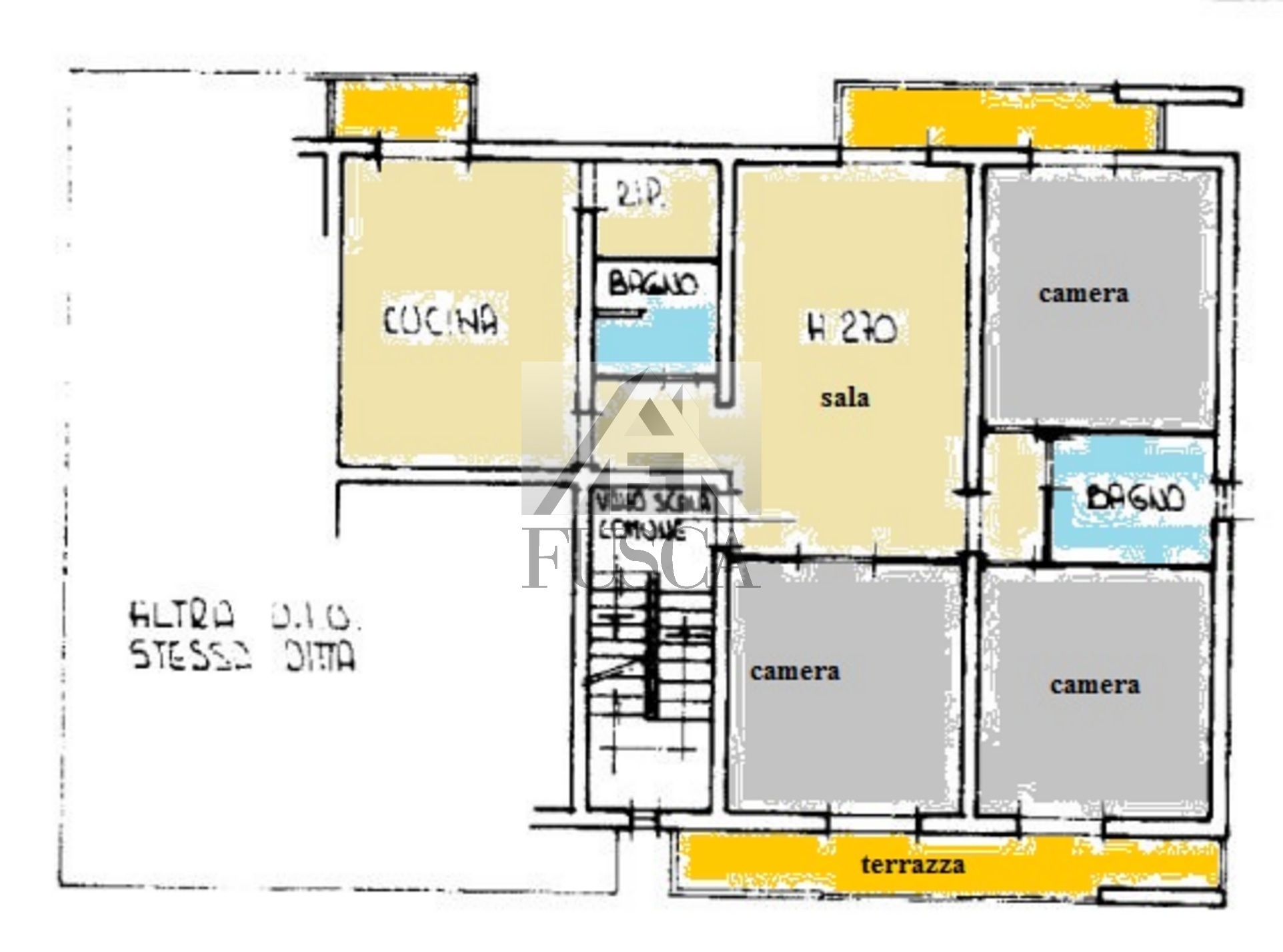 Si compone di : ingresso, ampia sala con terrazzo e caminetto, cucina abitabile con ripostiglio, 3 ampie camere, disimpegno, 2 bagni e 2 balconi.