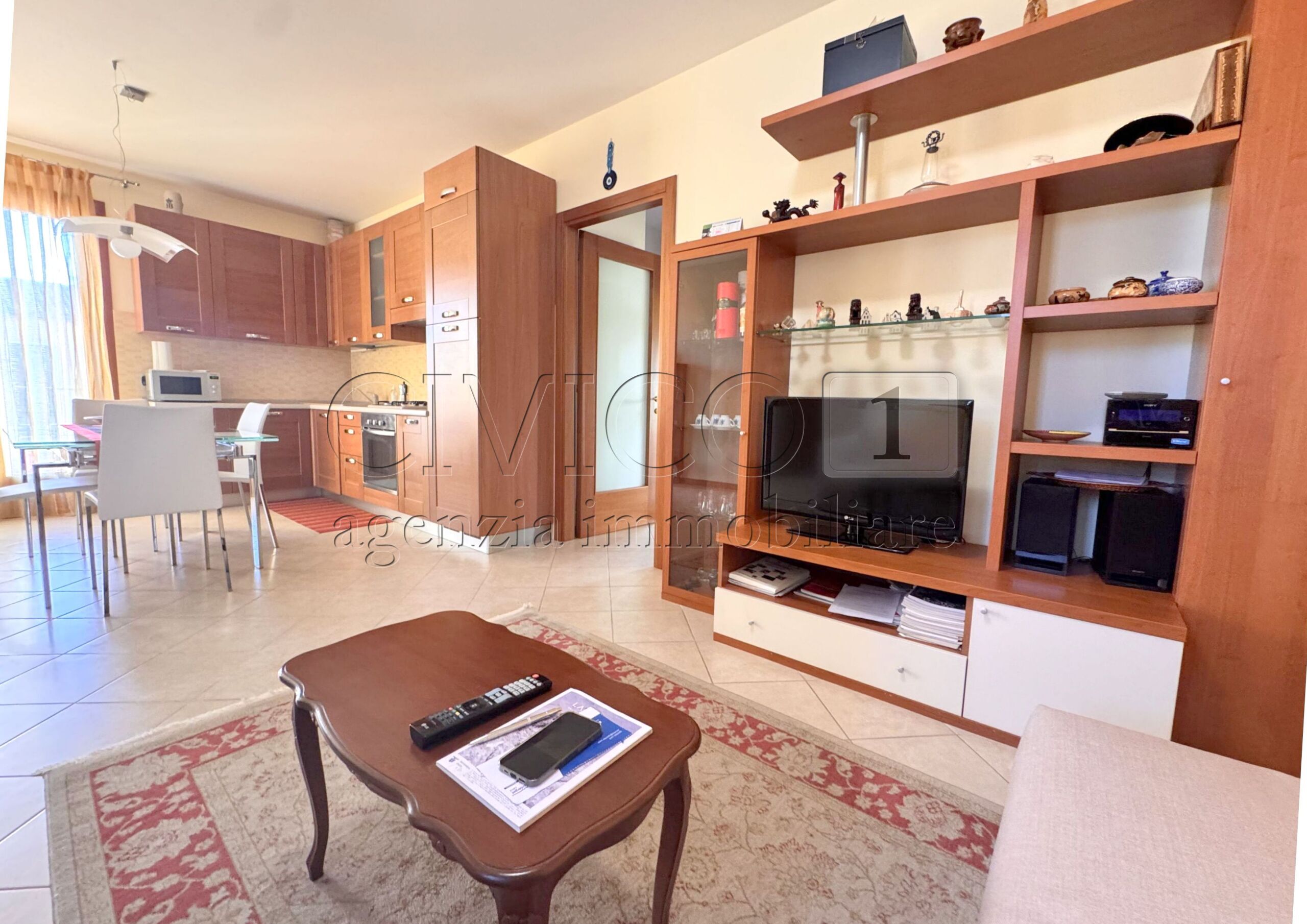 Lappartamento si apre sulla zona giorno con angolo cottura ed accesso diretto al terrazzino; il reparto notte è servito da due camere, un bagno finestrato dotato di vasca ed un bagno cieco dotato di doccia ad uso lavanderia.