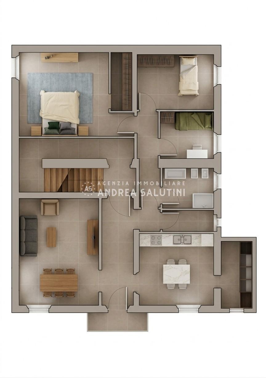Limmobile si sviluppa in modo funzionale e luminoso ed è così composto: ingresso con accesso al terrazzo, cucina abitabile, ampio soggiorno, bagno finestrato, comodo ripostiglio e tre camere da letto, di cui una matrimoniale dotata di cabina armadio.