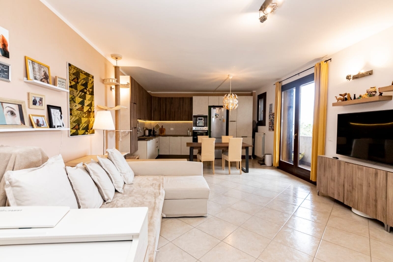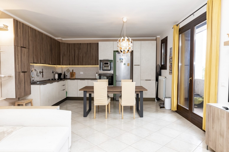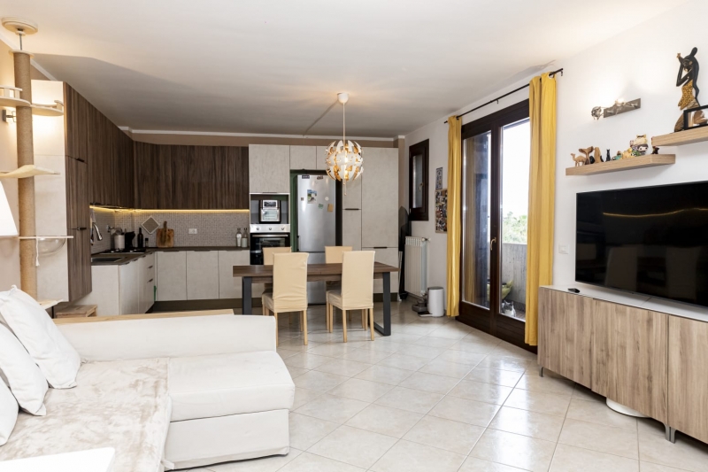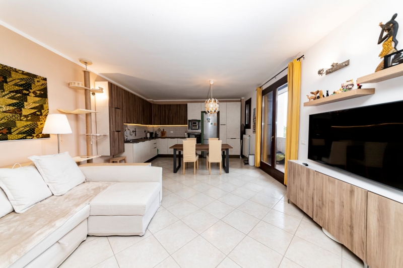Lingresso si apre su un soggiorno molto luminoso con cucina a vista e accesso al balcone, nella zona notte, due camere da letto (di cui una matrimoniale) entrambe con balcone, bagno finestrato con doccia e pratico vano lavanderia/ripostiglio.