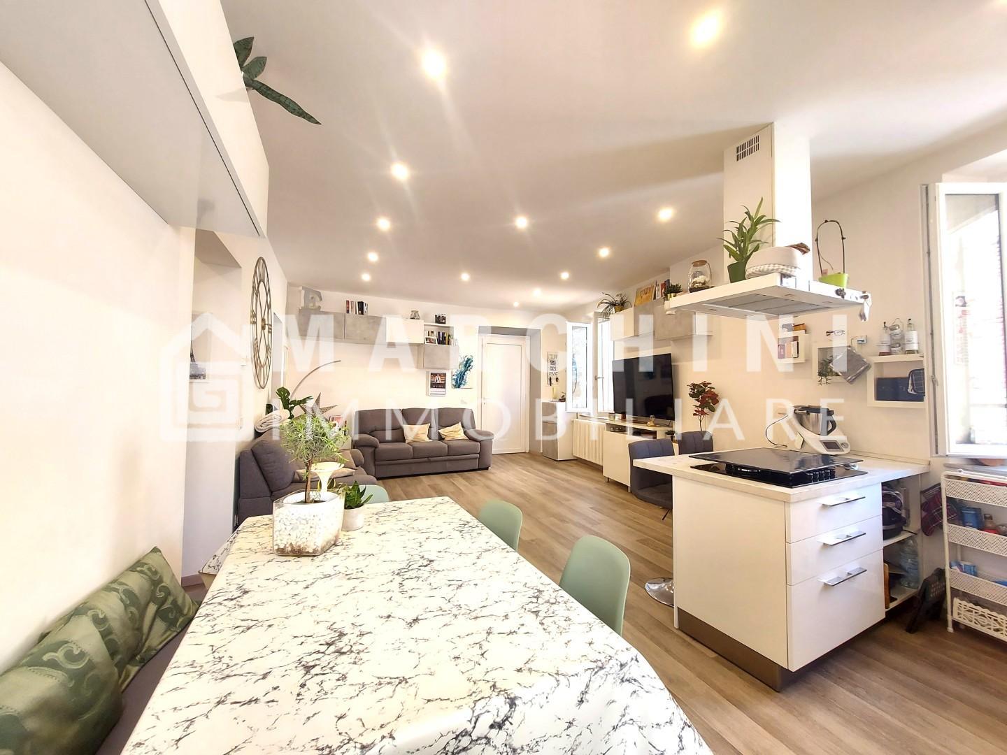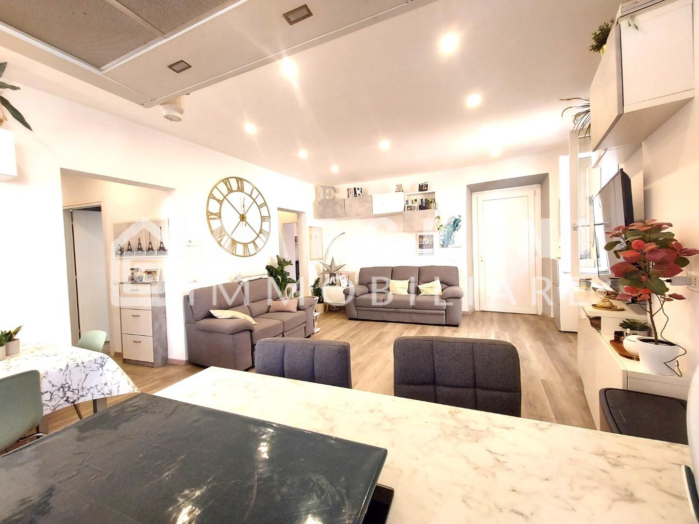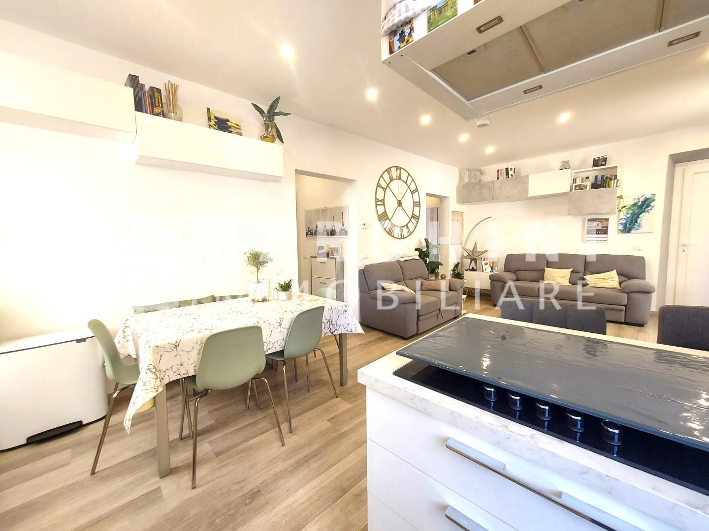 L' appartamento, posto al piano secondo e ultimo, si compone di ampio e luminoso open space con sala e cucina, e accesso allo studio/veranda con terrazzo; Mediante il disimpegno accediamo alla zona notte con ben 3 camere (una matrimoniale, una doppia e una singola) e 2 bagni con doccia e finestra; ripostiglio nel vano scala.