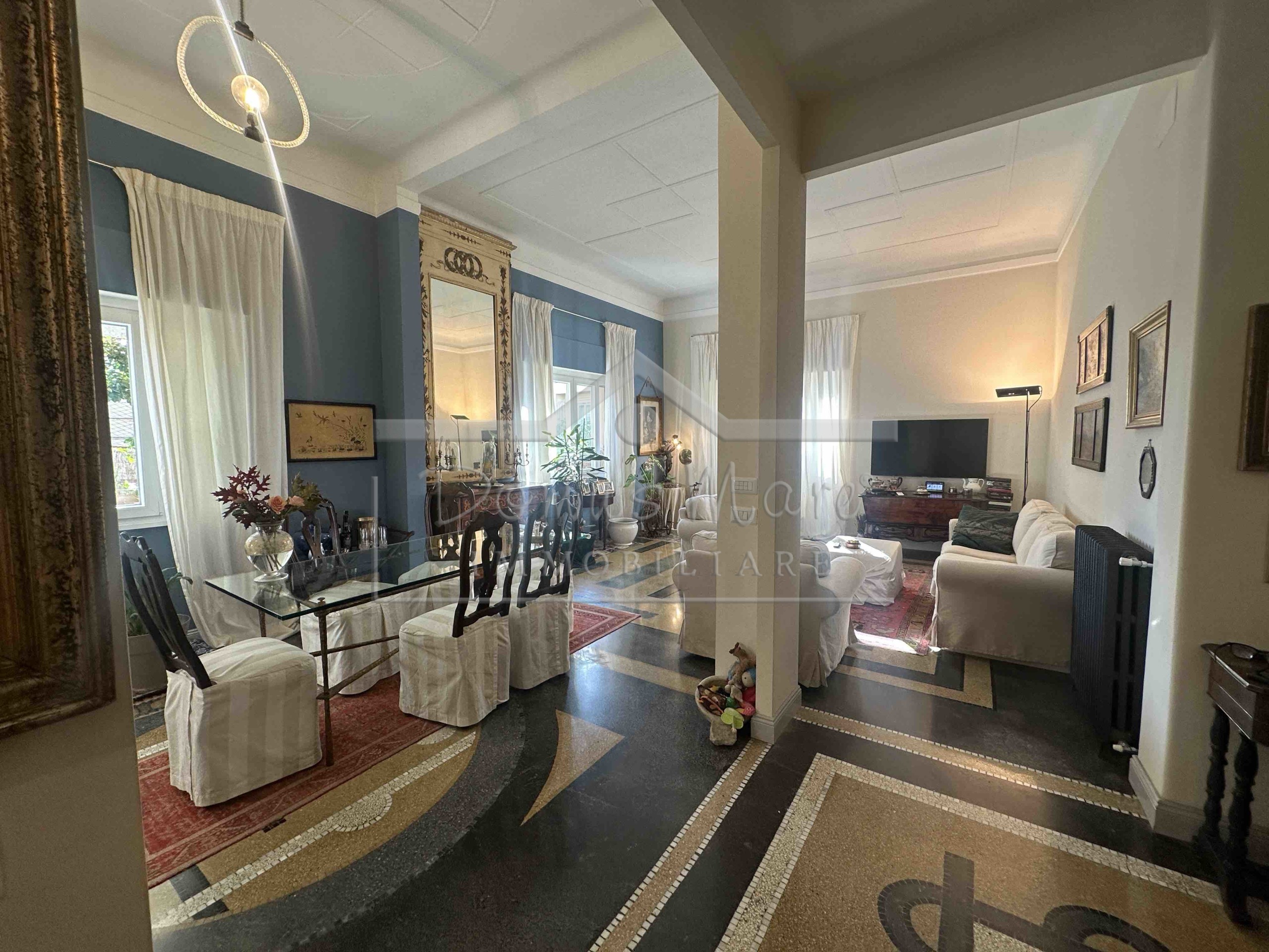 Un salone di grande metratura suddiviso in zona relax e sala da pranzo è caratterizzato , come il resto della casa, da splendidi pavimenti alla veneziana dai decori lineari di grande effetto.
