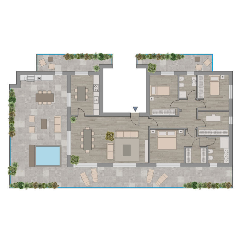 ARONA - RESIDENZE AURA Via XX Settembre ***.*******.** Atrico A1 - Prestige Prestigioso attico di 210 mq posto al secondo piano con ampi terrazzi di 133 mq con vista panoramica e piscina fuoriterra.