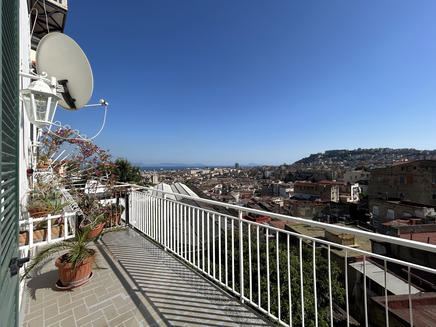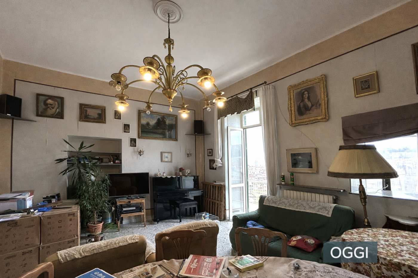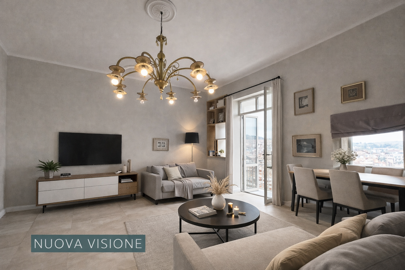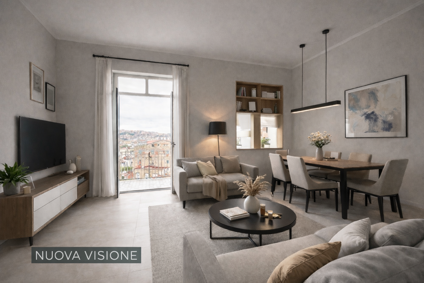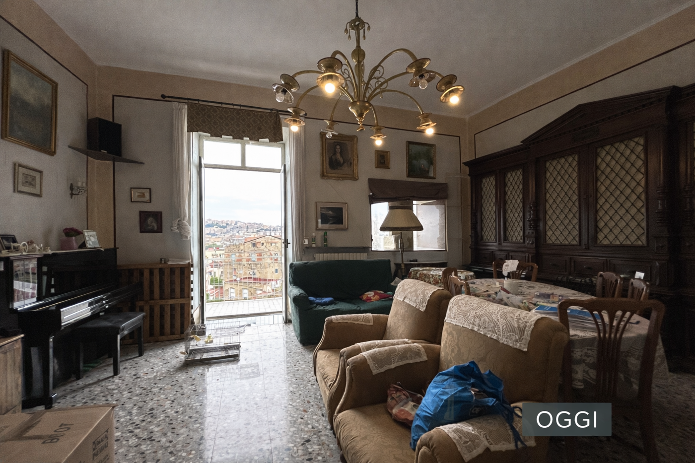Il salone doppio rappresenta il cuore della casa: uno spazio di rappresentanza, luminoso e arioso, con accesso diretto al balcone principale, da cui si gode una vista ampia e panoramica sulla citt fino al mare, capace di regalare respiro visivo e luce in ogni momento della giornata.