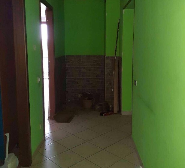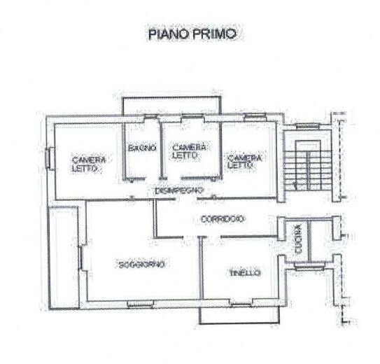 Piena proprietà di abitazione al primo piano, di tipo popolare, box auto e cantina, composta da: ingresso su corridoio, tinello, cucinino, soggiorno, disimpegno, tre camere da letto, bagno e tre balconi.