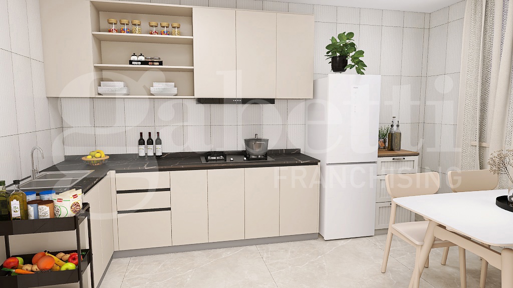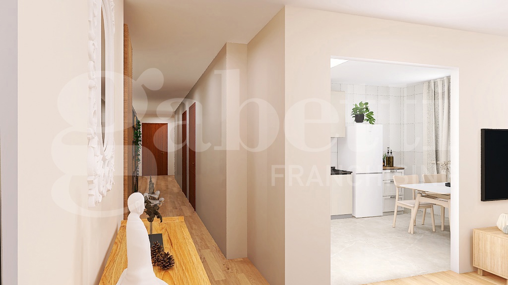 Lingresso conduce alla zona giorno composta da soggiorno e cucina, ben distribuiti e facilmente rimodulabili.