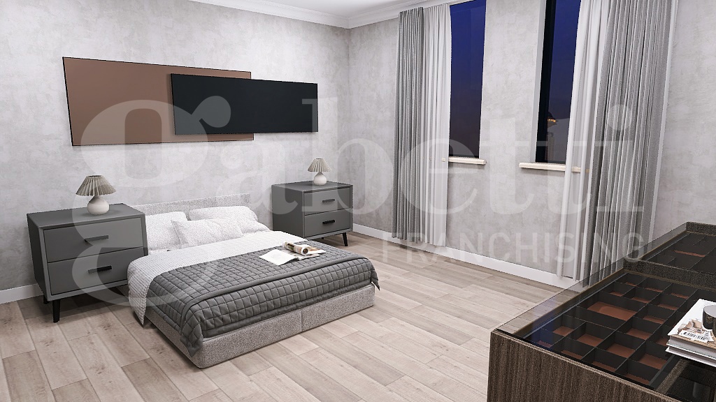 La zona notte comprende due camere matrimoniali di ampia metratura, oltre a uno studio ideale come area lavoro o terza stanza.
