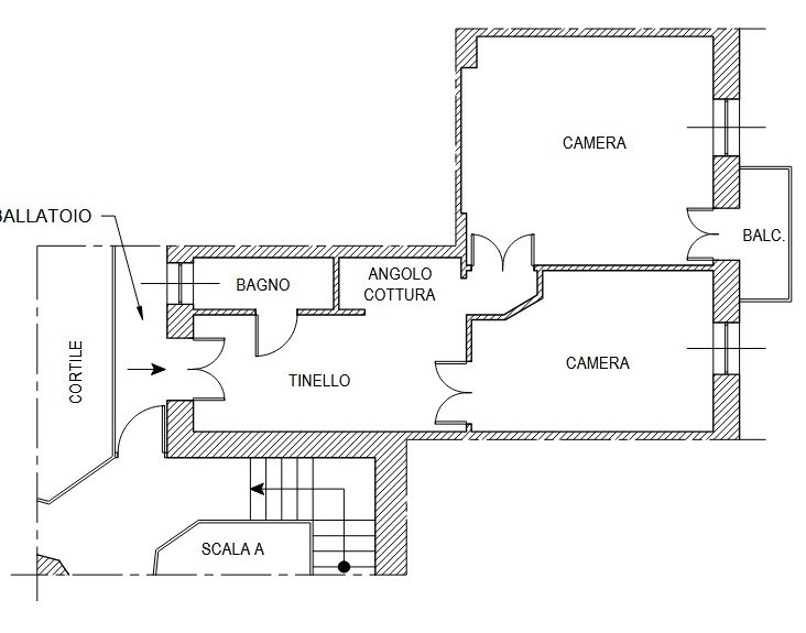 Alloggio al quarto piano (5 livelli) con accesso dal ballatoio, composto da due camere, tinello con angolo cottura, bagno e balcone con annessa soffitta al piano sottotetto (7 livelli). - Il prezzo visualizzato è la base d'asta, in quanto limmobile è oggetto di esecuzione immobiliare venduto tramite asta giudiziaria.
