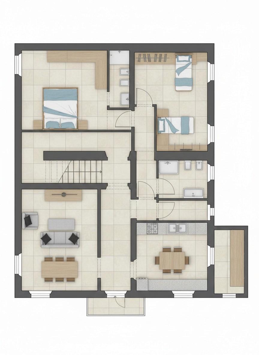 È presente un bagno principale ed è già prevista la predisposizione per la realizzazione di un secondo bagno in camera, con un costo aggiuntivo a carico dellacquirente pari a circa ?6.000. Dal punto di vista impiantistico, labitazione sarà dotata di caldaia a condensazione per il riscaldamento e la produzione di acqua calda, oltre alla predisposizione per limpianto di climatizzazione.