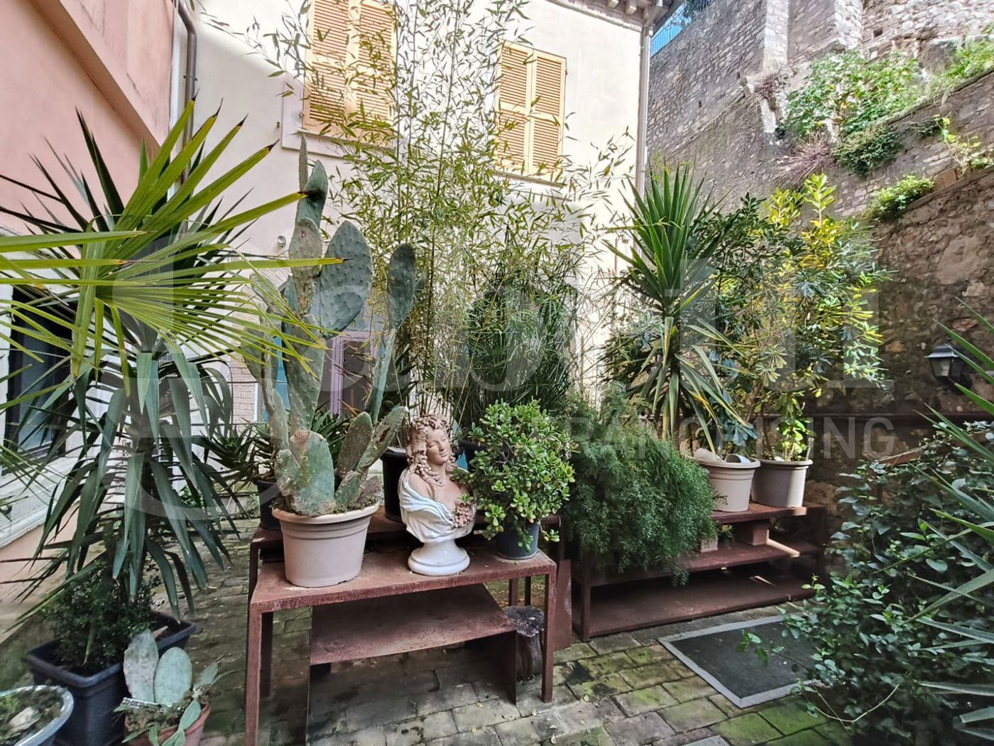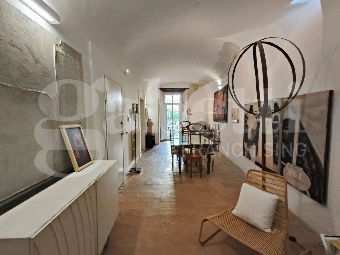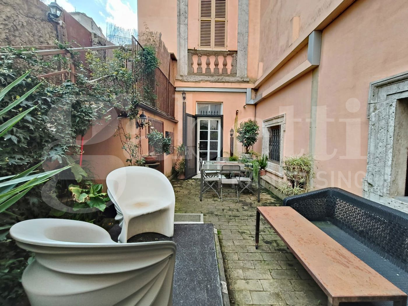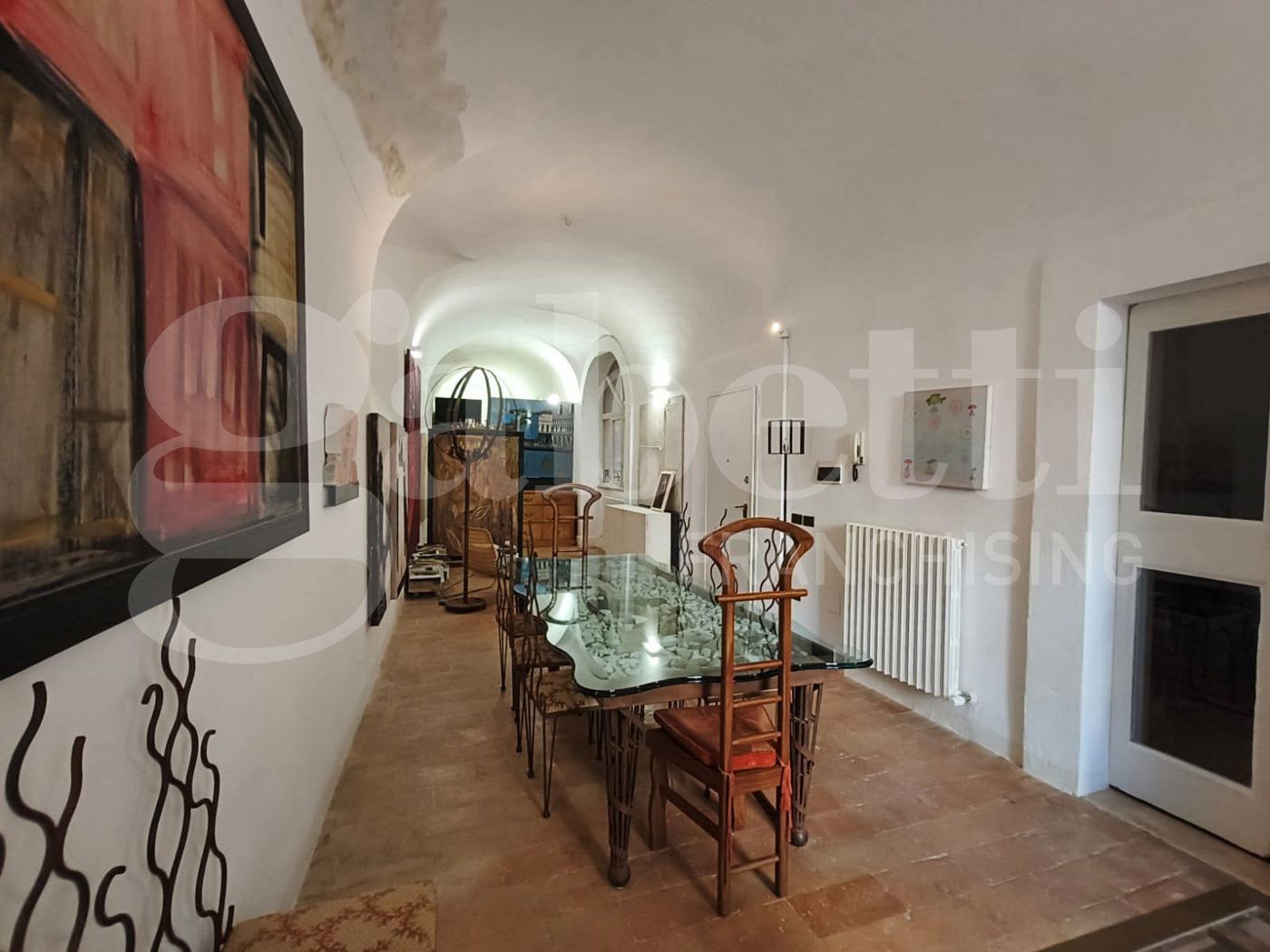 Lappartamento dispone di due ingressi: uno dallinterno del palazzo tramite la suggestiva scala elicoidale, e un accesso indipendente su un chiostro di uso esclusivo.