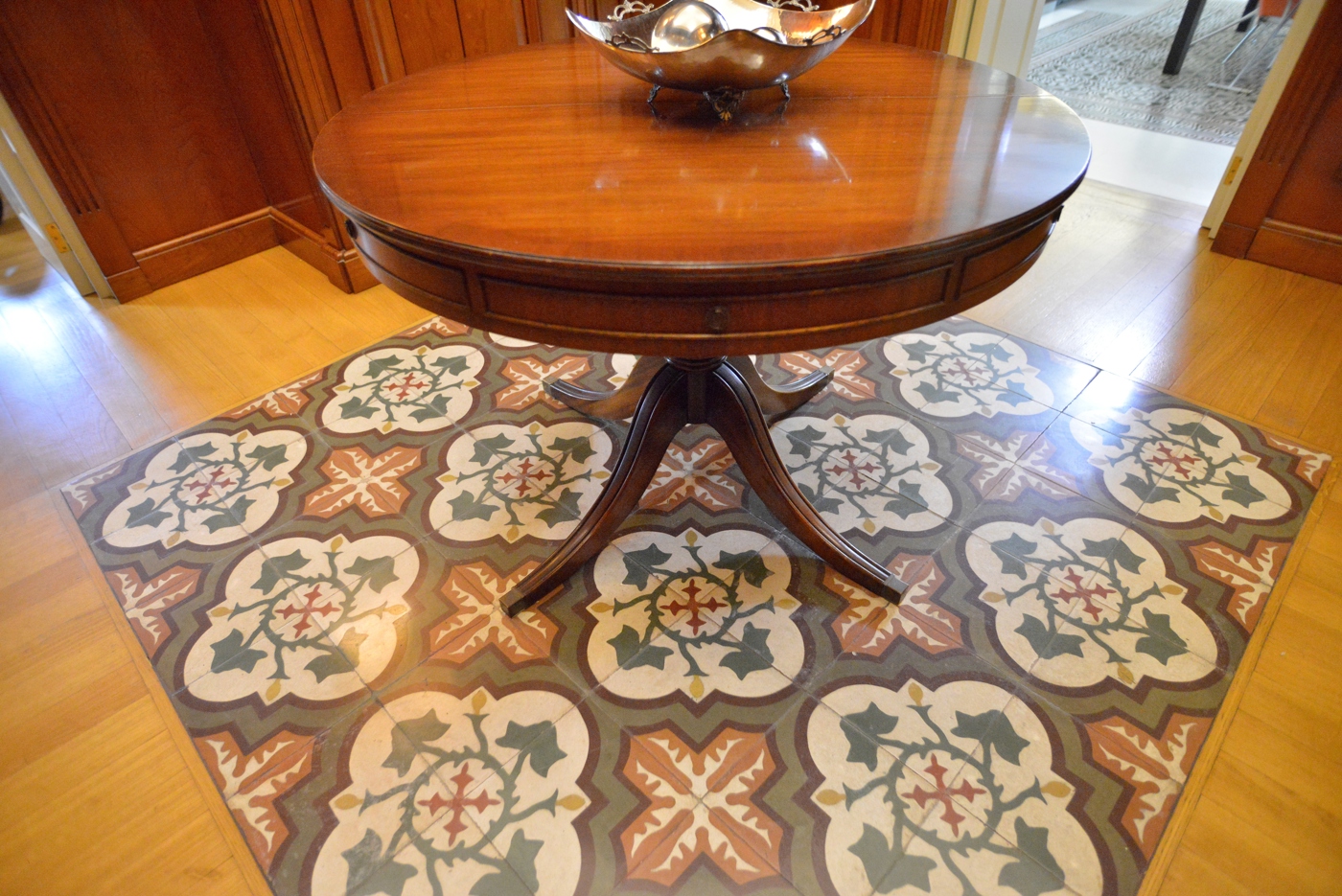I pavimenti originali, di cementine policromatiche dai pregiati disegni, sono incorniciati dai toni caldi del parquet.