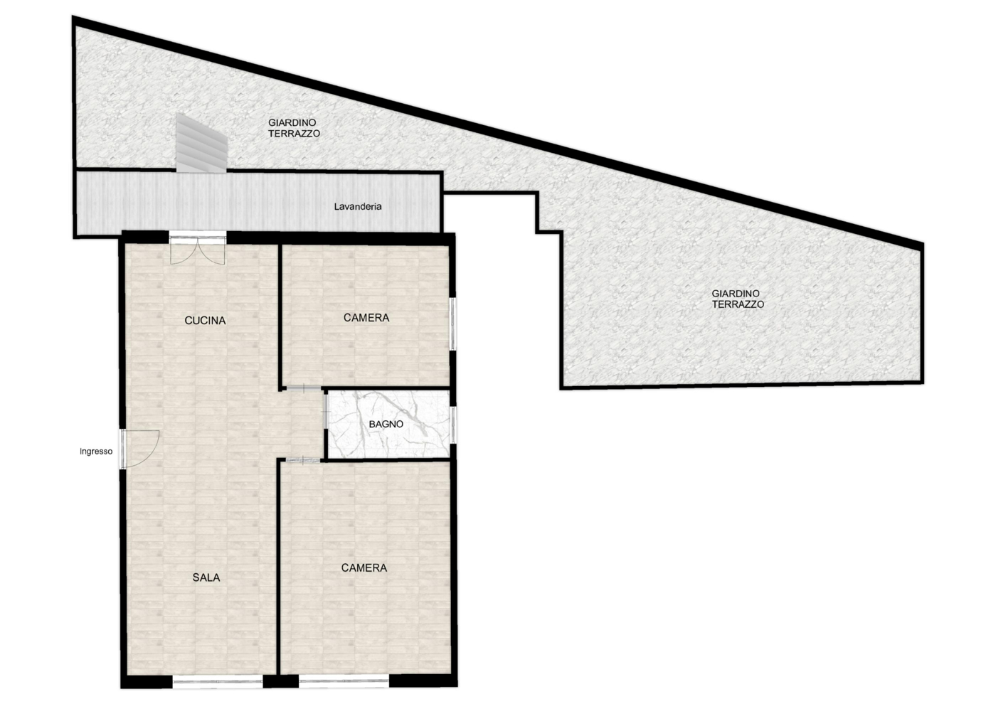 L'immobile, posto al primo piano, composto da: ingresso in un'accogliente open space dove soggiorno e cucina abitabile a vista creano un ambiente moderno e funzionale, 2 camere da letto, bagno con doccia e finestra, locale lavanderia da cui si accede al terrazzo attrezzato con acqua, luce e gazebo in legno.
